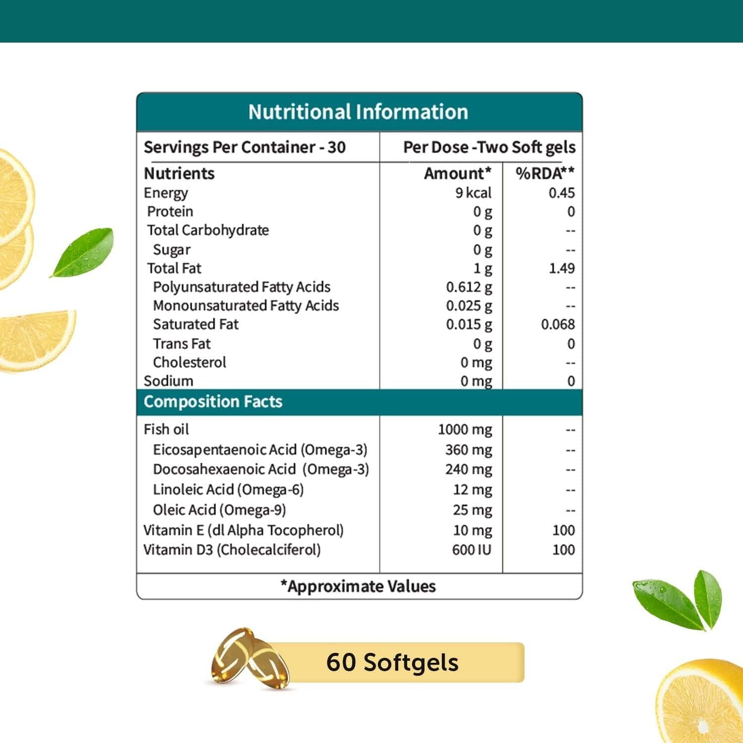 Fish Oil Omega 3 Capsule 1000 mg- Provides 360 mg EPA, 240 mg DHA per serving with Vitamin E & D3.