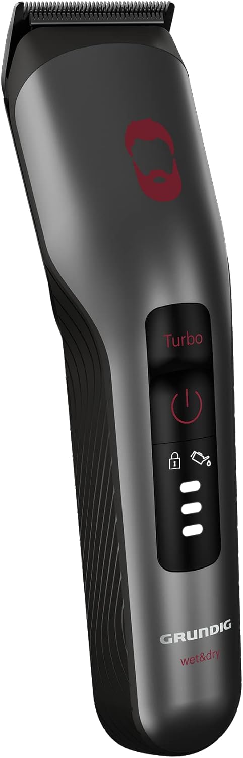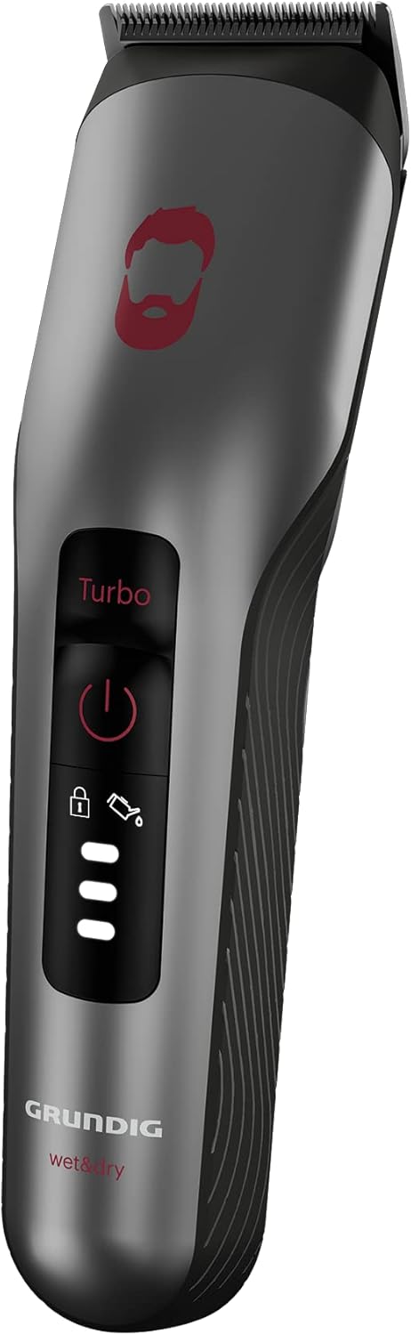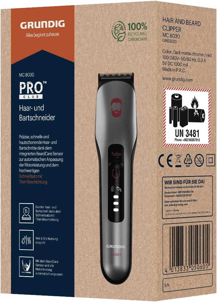 GRUNDIG ProClub MC 8030 Haar- en baardtrimmer, met BeardCare sensor, Titanium Blades-technologie, 2 kammen voor verschillende snijlengtes, lange looptijd, nat & droog, donker mat chroom/rood