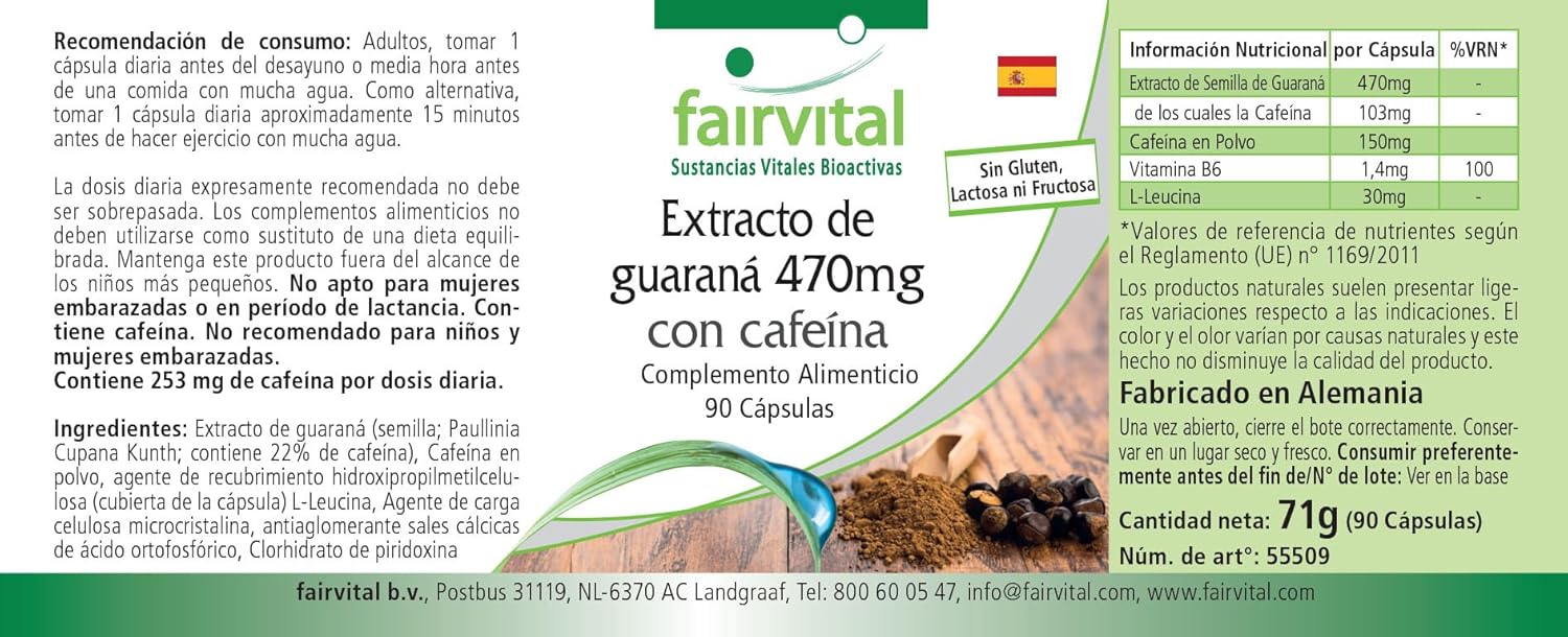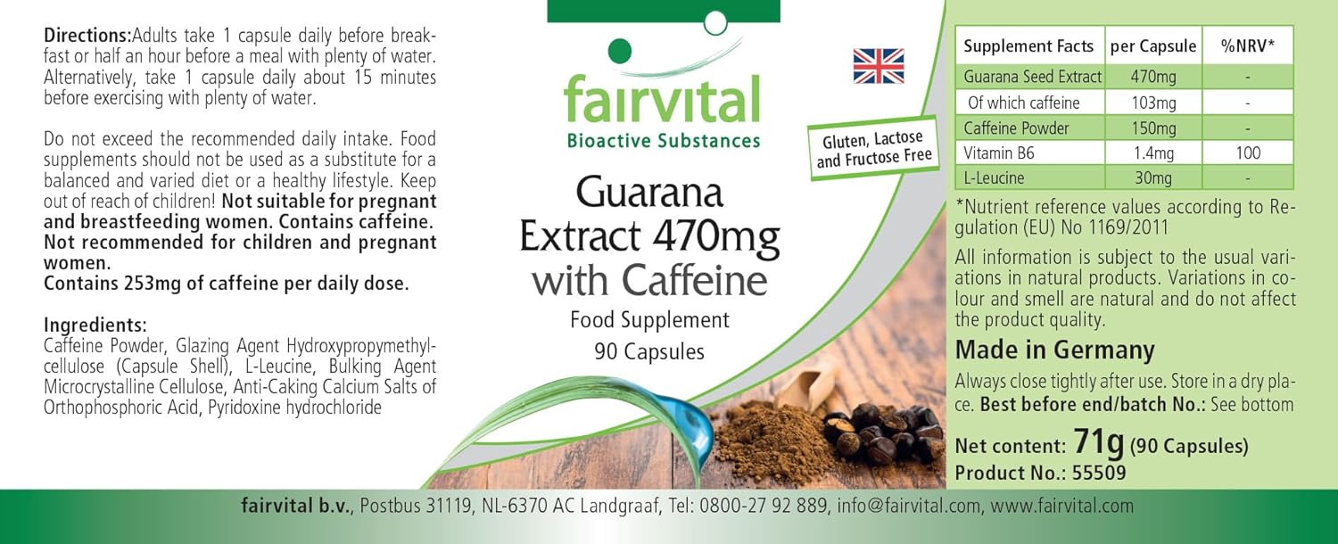 ✔ Fairvital DUITSE KWALITEIT: Dagelijkse dosis: Een capsule bevat 470mg guaranazaadextract waarvan 103mg cafeïne, 150mg cafeïnepoeder en 1,4mg vitamine B6. 90 capsules! Uitstekende prijs-kwaliteitverhouding!