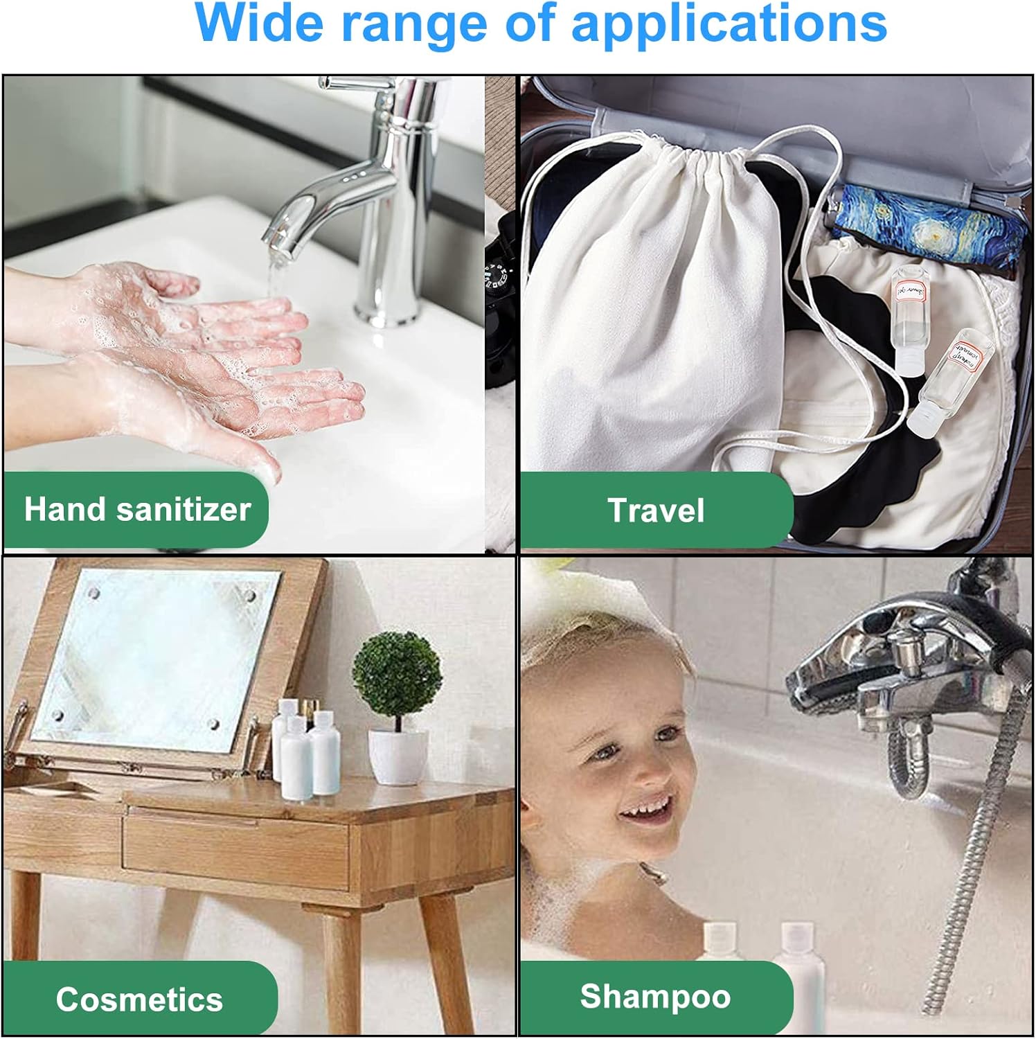 Deze reisflessen kunnen worden gebruikt voor het bewaren van vloeistoffen en toiletartikelen, zoals shampoo, conditioner, parfum, handzeep, douchegel, lotion, zonnebrandcrème, oogcrème en andere vloeistoffen. Hij kan worden gebruikt voor reizen, zakenreizen, kamperen enz. Het is een goede partner voor je reis.