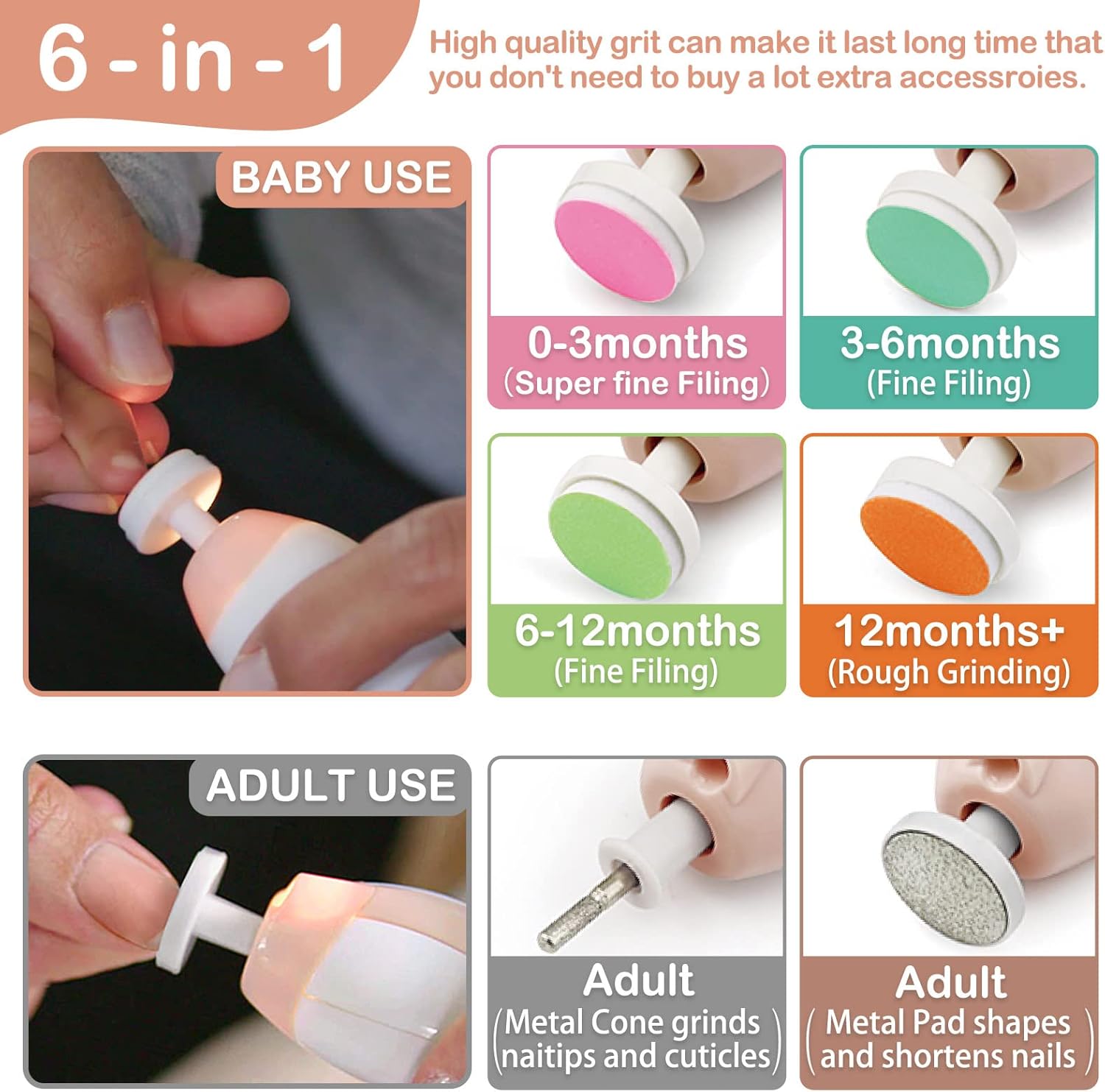 Haakaa Elektrische babynagelknipper, babynagelvijlset met 6 schuurkoppen en 4 extra reserveschuurpapiertjes en ledlicht voor pasgeborenen, peuters of volwassenen, roze