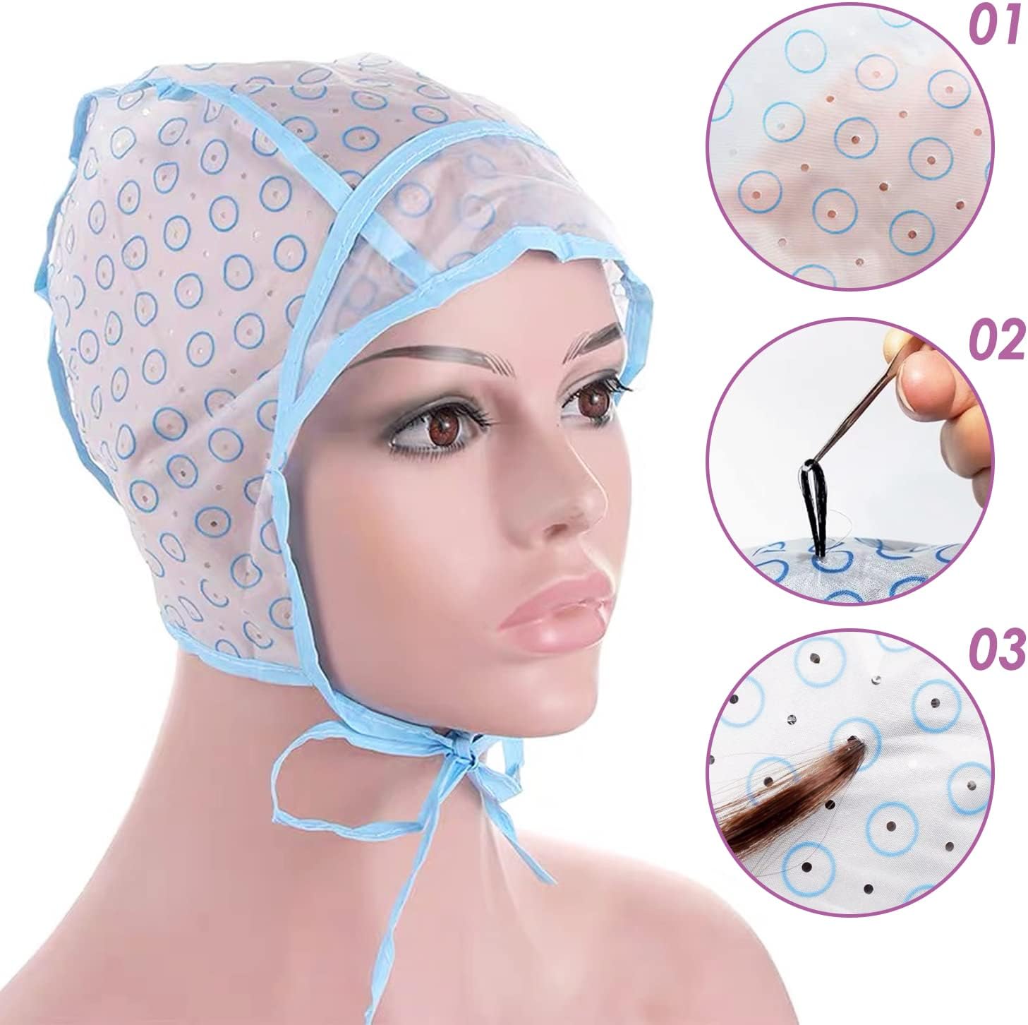 ✔【 Haarverfhelper】Deze haarkapjes hebben veel gelijkmatig verdeelde kleine gaten, met de haarnaald kun je wat haar uit deze gaten trekken, dan verf je favoriete kleur om een stijlvol en uniek kapsel te creëren.