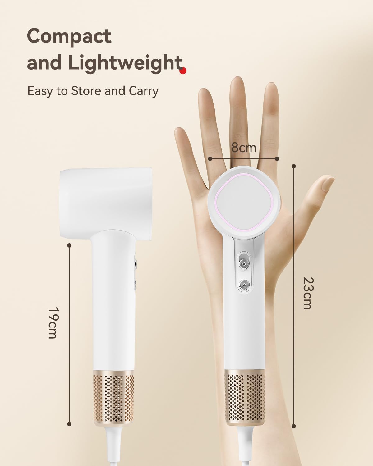Compact en Draagbaar met Diffuser: Lichtgewicht (slechts 348 g) en ergonomisch ontworpen voor ultiem gebruiksgemak. Het fijne filter voorkomt dat je haar wordt ingezogen, terwijl de 360° magnetische mondstuk en diffuser geschikt zijn voor elk haartype. Perfect voor thuis of onderweg—ook een geweldig cadeau