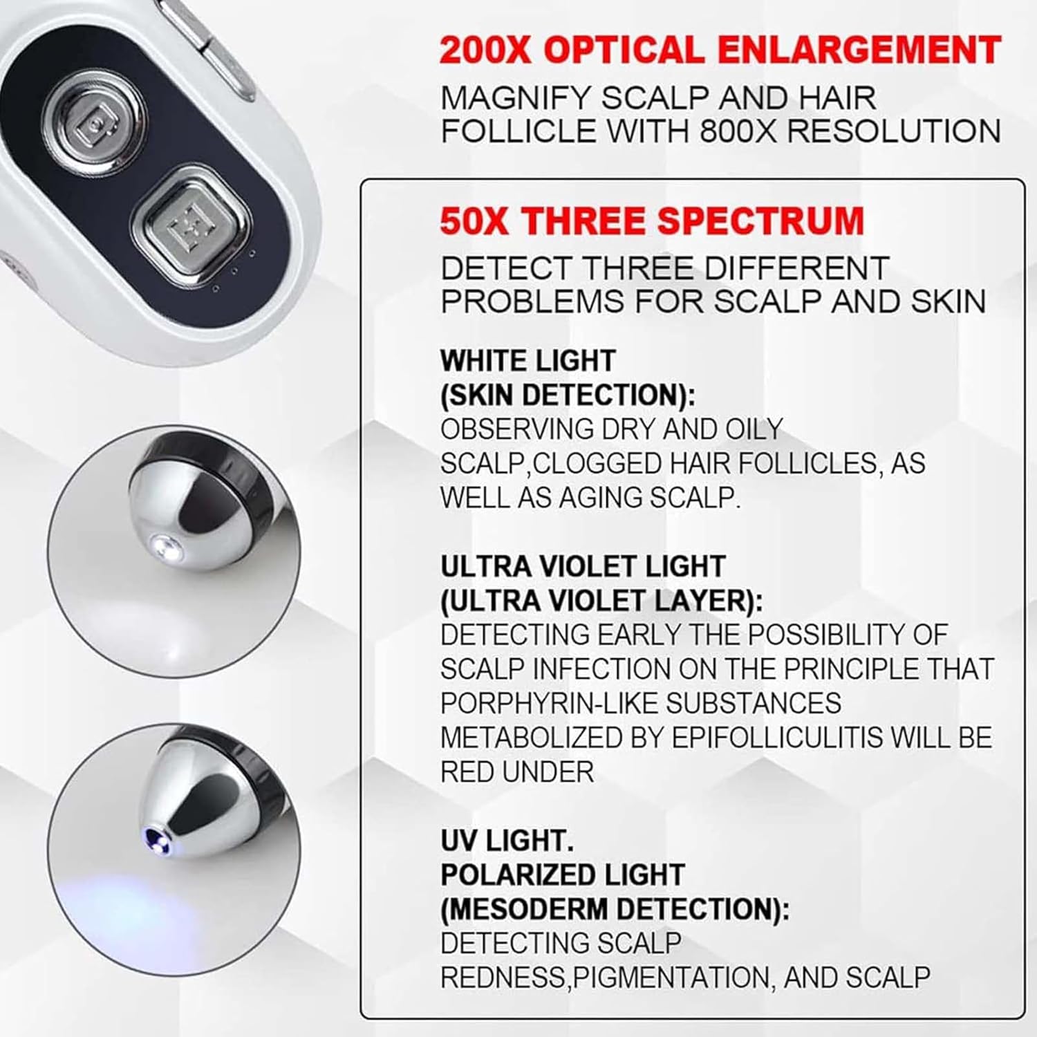 MULTIFUNCTIONELE HOOFDTEST: Identificeert de mate van haarverlies, test de vochtigheid en elasticiteit van het haar, meet het oliegehalte van de hoofdhuid en de haarglans. Detecteert problemen met de haarzakjes, de gevoeligheid van de hoofdhuid en meet de lengte van de pasgeboren villi. Ideaal voor kapperszaken, schoonheidssalons, spa’s, massagesalons, enz.