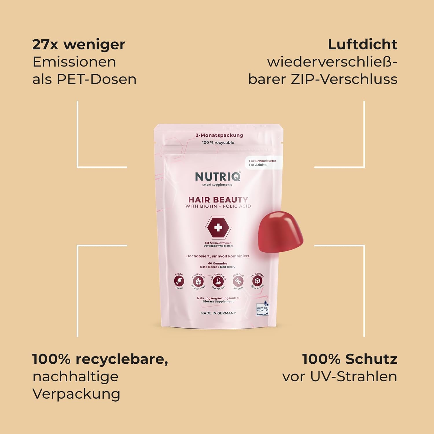 Diese Vitamingummibärchen kommen in einer wieder verschließbaren Tüte an. Pro Tag sollte nicht mehr als eins gegessen werden, da hier neben Folsäure und Biotin, auch viele weitere Vitamine wie A, B, D und E teils schon vollständig enthalten sind. Hier sollte also vorher geschaut werden, ob diese Gummibärchen überhaupt das ergänzen, was man ergänzen möchte. In meinem Fall ergänzen die Gummibärchen tatsächlich zuviel, weswegen ich sie nach der 2 monatigen Anwendung auch nicht erneut kaufen werde.Geschmacklich sind die Gummibärchen ganz ok. bei mir kommt immer ein leichter Zink-Geschmack durch. Sie sind aber nicht zu süß.Bei der Wirkung kann ich tatsächlich nichts berichten, da sich zumindest bei mir bisher nichts tat. Hier muss ich aber auch gestehen, dass ich die Wirkung von Biotin hier wieder einmal zu omnipräsent halte, denn einen Mangel an Biotin ist zumindest bei uns in Europa so gut wie ausgeschlossen. Zudem werden 5000% davon nichts bringen, denn wenn der Körper genug hat, scheidet er den Rest einfach wieder aus.Für mich persönlich sind dies hier eher Multivitamingummibärchen, die eben zusätzlich noch Biotin und Folsäure enthalten. Braucht man sie? Wahrscheinlich nicht.