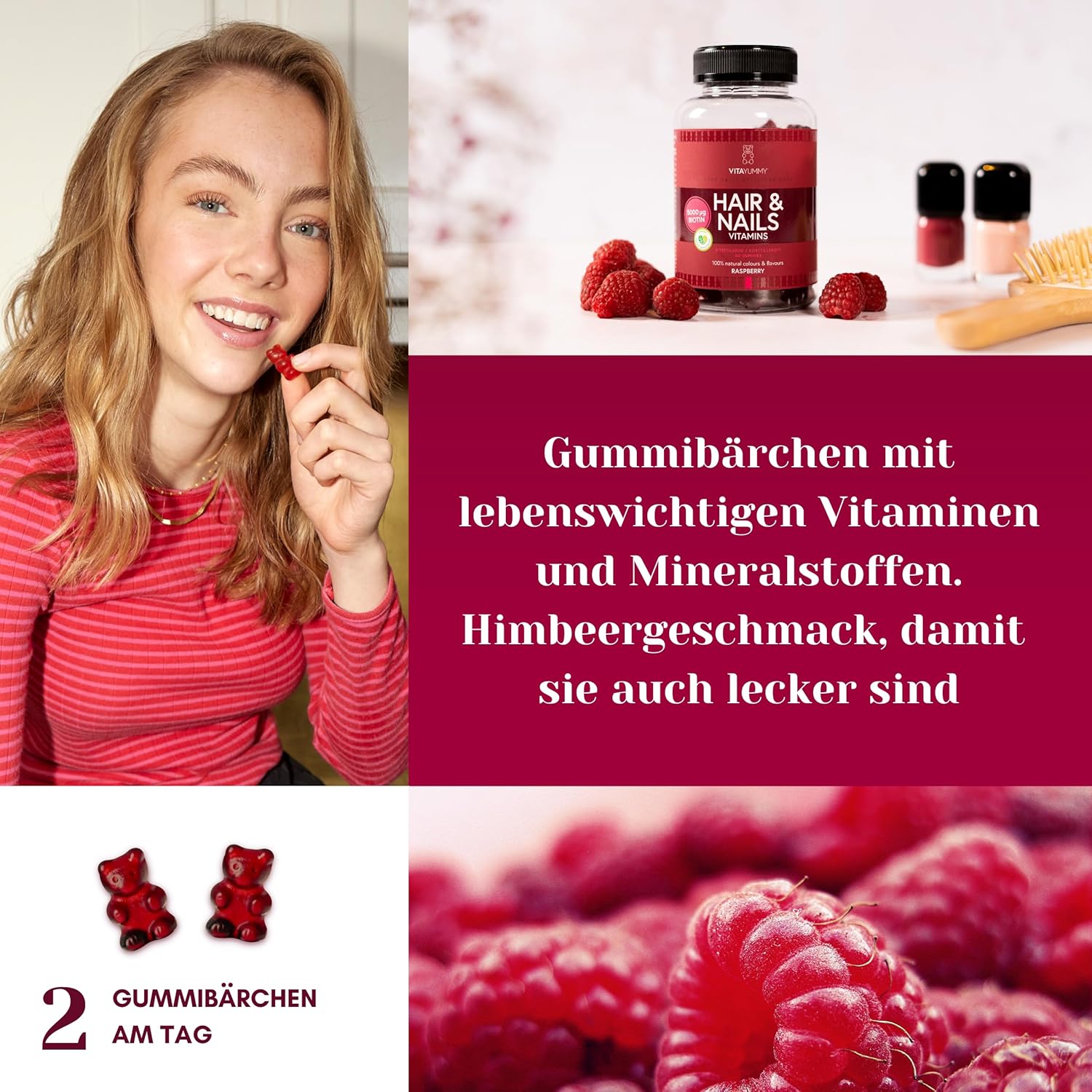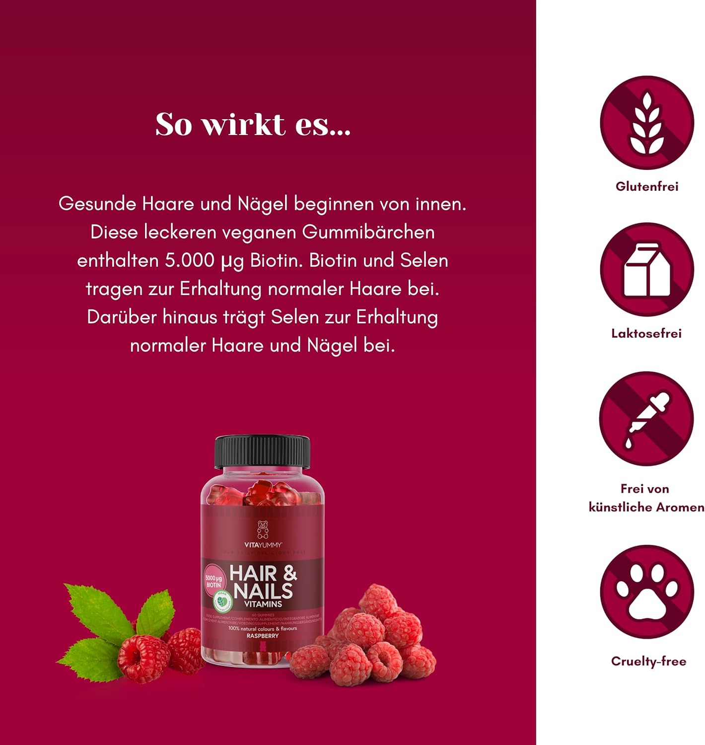 Uitstekend als pillen: hou je niet van de smaak van vitaminen of vind je het moeilijk om pillen in te slikken? Vitaminegoms met natuurlijke smaak zijn de huidige trend op het gebied en we hebben de formule onder de knie gebracht om de beste resultaten voor haar- en nagelgroei te bereiken. Werkformule: wij hebben een voedende formule met biotine, vitamine C en foliumzuur ontwikkeld om belangrijke voedingsstoffen te bieden ter ondersteuning van groei, kracht en glans. Ontworpen om de haargroei te stimuleren, haaruitval te voorkomen en je huid en nagels gezonder te maken. Organisch, geen kunstmatige stoffen. In plaats van kunstmatige aroma’s en additieven richten onze natuurlijke en organische producten zich op een sterke mix van vitaminen, die echte resultaten veroorzaken. Door krachtige tests en feedback van onze trouwe klanten vonden we de optimale consistentie voor vitamine gummibeertjes. Ze zijn gemakkelijk te kauwen en in te slikken en laten je niet opgeblazen voelen. Hypoallergeenvrij, veganistisch en gelatinevrij: onze allergeenvrije en veganistische producten worden met trots gemaakt van hoogwaardige ingrediënten om maximale gezondheid en resultaten te garanderen. In tegenstelling tot de marktstandaard hebben we gelatine vervangen door het natuurlijke ingrediënt pectine, omdat we ons richten op dierproefvrij blijven. Gemaakt in Duitsland: kwaliteit is onze hoogste prioriteit, daarom worden onze producten in Duitsland geproduceerd. Vitayummy vindt zijn oorsprong in Denemarken en wij streven ernaar om de hoge Scandinavische standaard in onze producten te bieden.