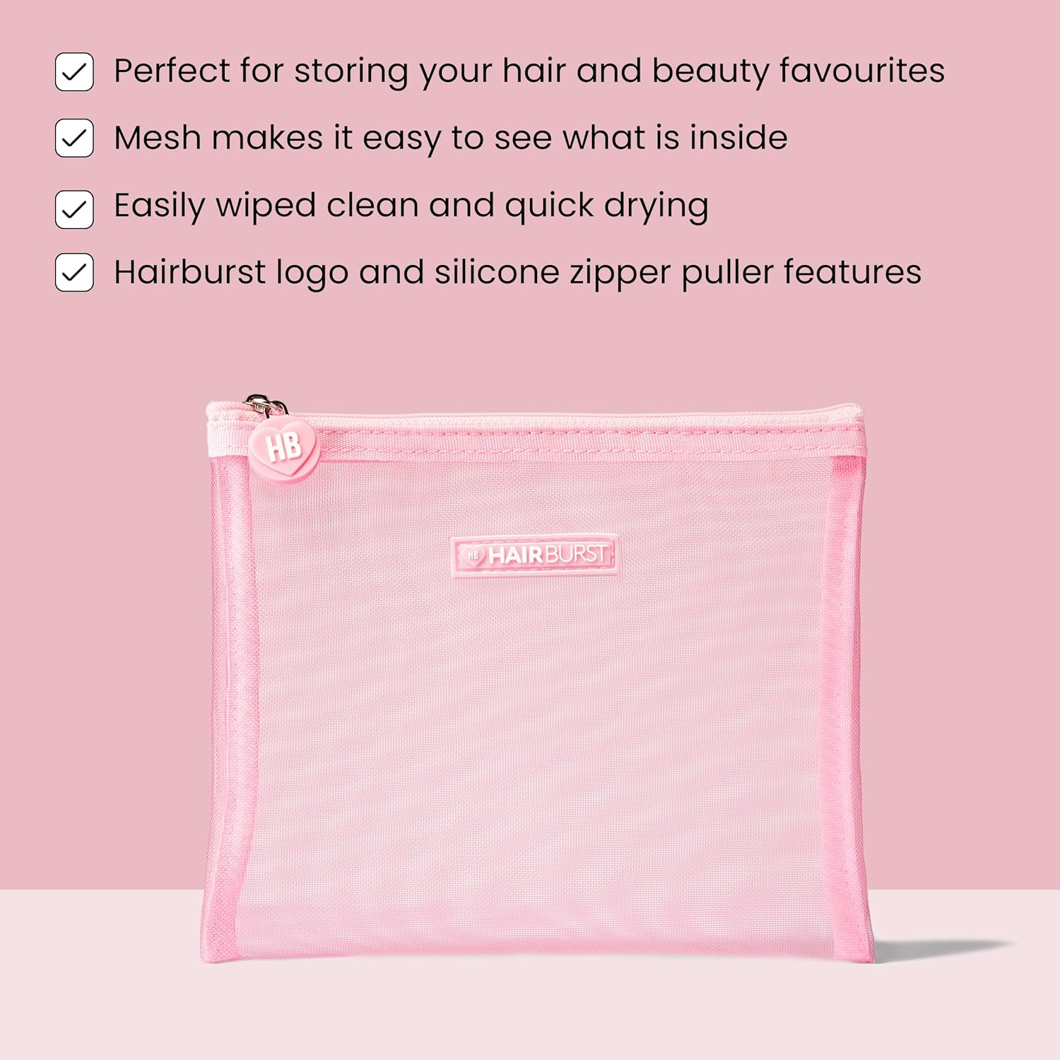 Organiseer in stijl — Houd al je Hairburst-miniaturen, vitamines en beautynietjes netjes verpakt met deze Pink Mesh Wash Bag. Het luchtige mesh-ontwerp zorgt voor snel drogen en gemakkelijke zichtbaarheid – een chique, delicate waszak voor elke gelegenheid