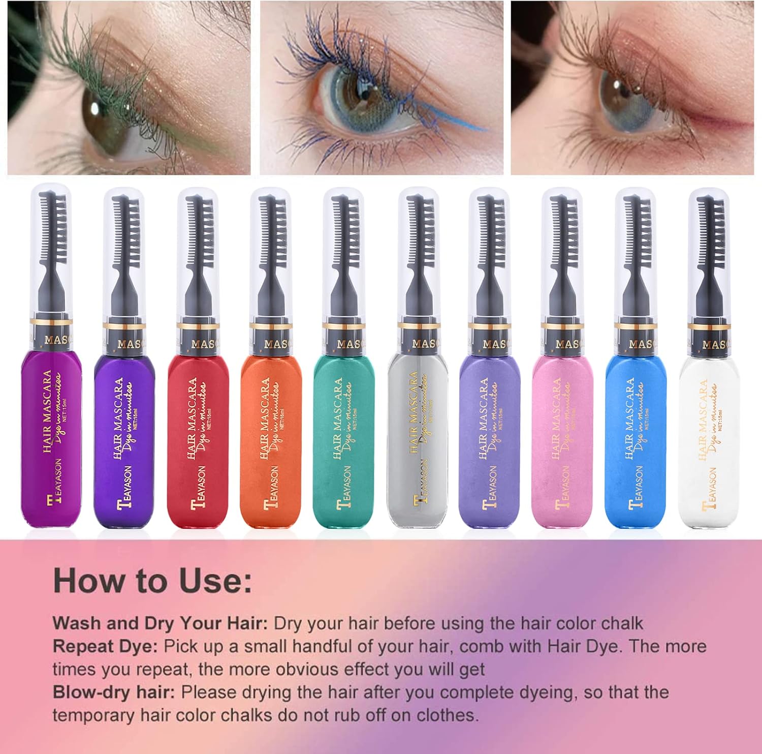 Schneller Versand, viele Farben.Liegt biserl schwer im Haar, da Mascara. Jedoch für den Preis ist’s ok.