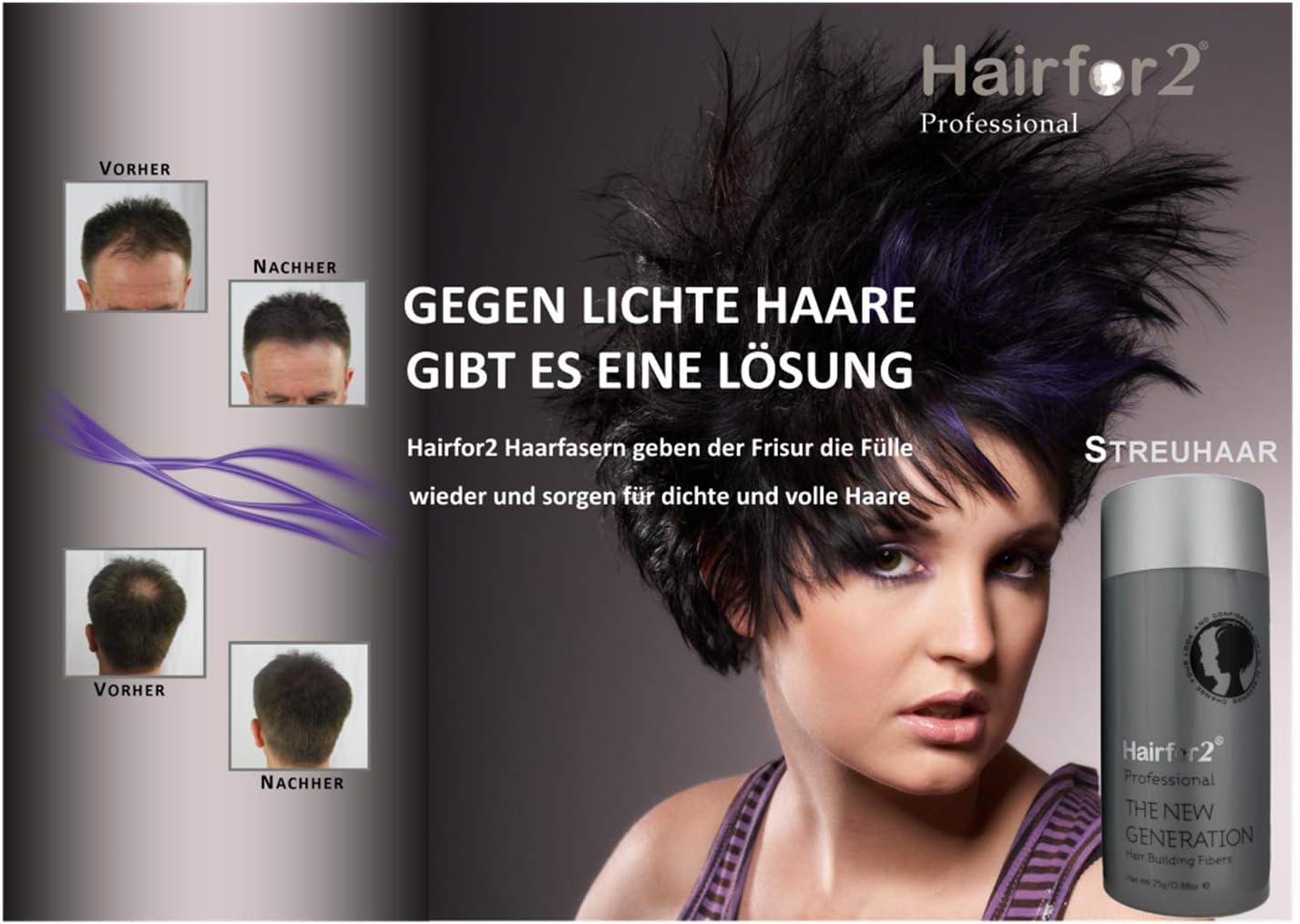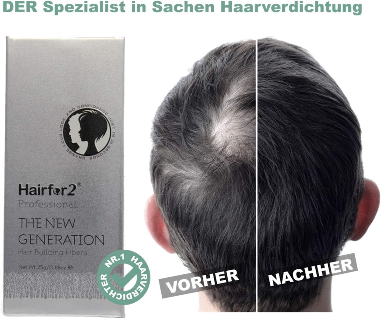 Hairfor2 geeft je nieuw zelfbewustzijn en verjongt je uiterlijk in slechts enkele minuten. Hairfor2 is een sensationele haaropvulling met een ongelooflijk effect, die doet wat hij belooft. Drijf met Hairfor2 elke dag weer je favoriete sport en geniet van een wandeling, ook op winderige dagen. Zelfs zonlicht en helder discolicht laten geen lichte plekken meer zien. Hairfor2 wordt wereldwijd aanbevolen door toonaangevende haarspecialisten en haarchirurgen. Hairfor2 is volledig onschadelijk voor je haar. De gezonde groei van je haar wordt niet beïnvloed.