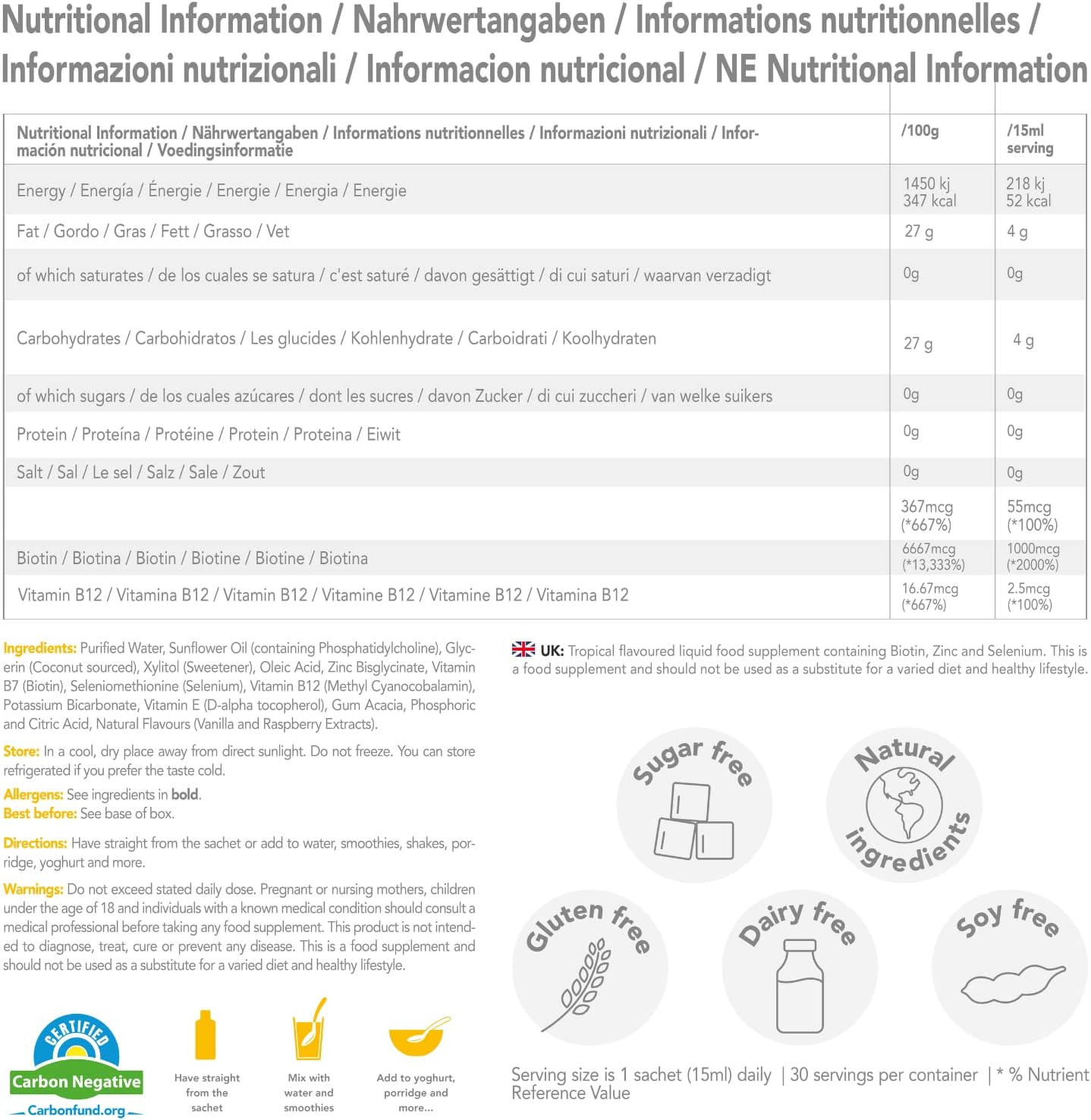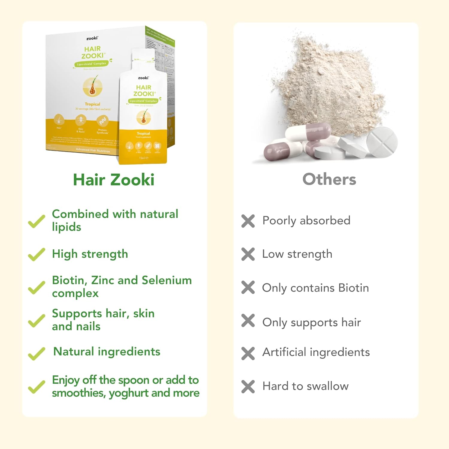 HairZooki® Biotine, zink en selenium met hoge sterkte verpakt in lipiden voor maximale absorptie | Alcoholvrij, veganistisch, sojavrij, natuurlijke ingrediënten | Ondersteuning van haar, huid en nagel (Tropisch, 30 porties)