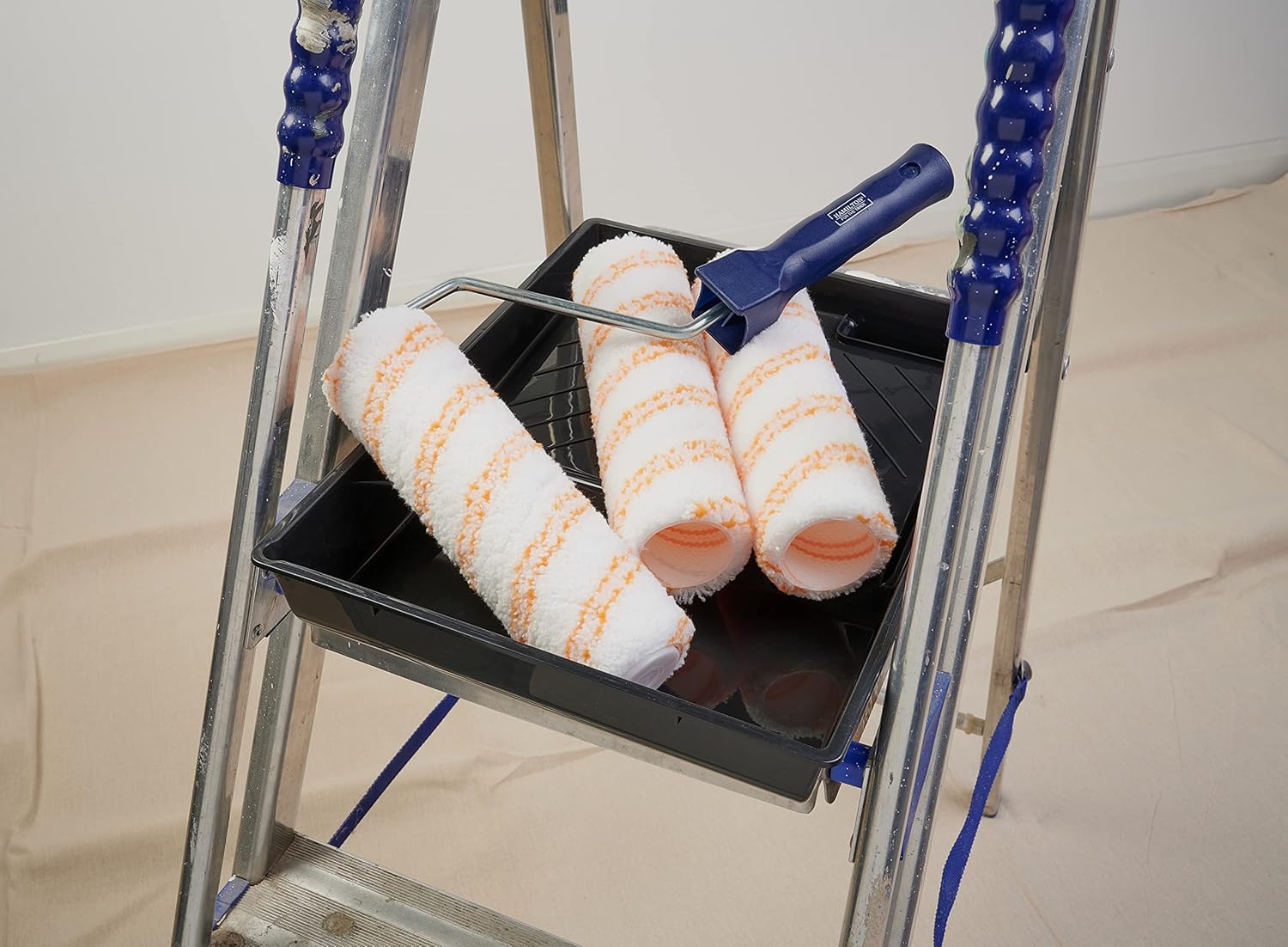 Onze 5 Piece For the Trade 9 ″ Roller set bevat hoge specificatie poly blend medium pile roller sleeves voor een goede verf pick-up en een gladde afwerking op gladde en semi-gladde oppervlakken. Geschikt voor gebruik met emulsie en eierschalen op basis van oplosmiddelen en waterbasis. Gebruik een middelhoge pool huls voor oppervlakken zoals houtsnippers of licht gevormd, of een eerder geverfde muur.