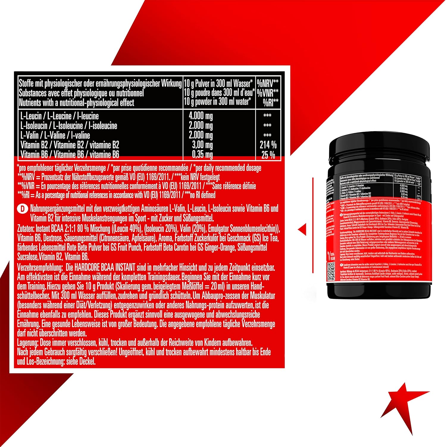 Voedingssupplementen met vitamine B2 en B6 en vertakte keten aminozuren (bij intensieve spierinspanning en harde training), met zoetstoffen. In onze HARDCORE BCAA INSTANT worden de vrije kristalliene aminozuren in een veredelingsproces geïnstantiseerd, waardoor ze volledig oplosbaar worden en sneller in de spiercel aankomen. De uitstekende smaken van Ice Tea, Fruit Punch en Ginger Orange zijn onverslaanbaar met uitstekende oplosbaarheid. Bovendien is het glutenvrij, lactosevrij, palmolievrij en aspartaamvrij. Opmerking: een evenwichtige en gevarieerde voeding en een gezonde levensstijl zijn van groot belang. Overschrijd de aangegeven dagelijkse hoeveelheid niet. Instant BCAA 2:1:1 80% mengsel (leucine 40%), isoleucine 20%), valine (20%), emulgator zonnebloem-lecithine)), (magnesiumzouten van vetzuren), vitamine B6, dextrose, zuurmiddel (citroenzuur, appelzuur), aroma, kleurstof suiker. karakters bij smaak (GS) Ice Tea, kleurend voedsel, rode bietpoeder bij GS Fruit Punch, kleurstof bètacaroteen bij GS gember-sinaasappel, zoetstoffsucralose, vitamine B2, vitamine B6. Aanbevolen consumptie: de Hardcore BCAA INSTANT kan in meerdere opzichten en op elk moment worden gebruikt. Het meest effectief is de inname tijdens de volledige trainingsduur. Begin met het innemen vlak voor de training. Voeg hiervoor 10 g product toe (schaal volgens meegeleverde maatlepel = 20 ml) in onze handschudbeker. Met 300 ml water vullen, omdraaien en grondig schudden. Om de afbraakprocessen van de spieren (vooral tijdens een dieet/letsel) tegen te gaan of om andere voedingseiwitten te verbeteren, is het gebruik ook aan te bevelen.. Opslag: blik altijd gesloten, koel, droog en buiten het bereik van kinderen bewaren