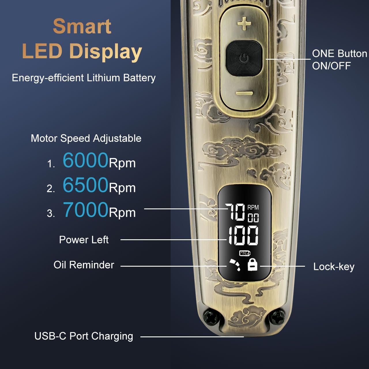 Verstelbare motorsnelheid:Deze baardtrimmer is uitgerust met een duurzame motor met een standaardsnelheid van 6000 tpm, die kan worden verhoogd tot 7000 tpm in de snelheidsregelmodus om hardere haren te knippen of haar snel te trimmen en te zorgen voor een schone en rechte rand voor je baard/haar. De motor is bestand tegen veelvuldig gebruik, werkt soepel en stil en is minder gevoelig voor oververhitting en slijtage.