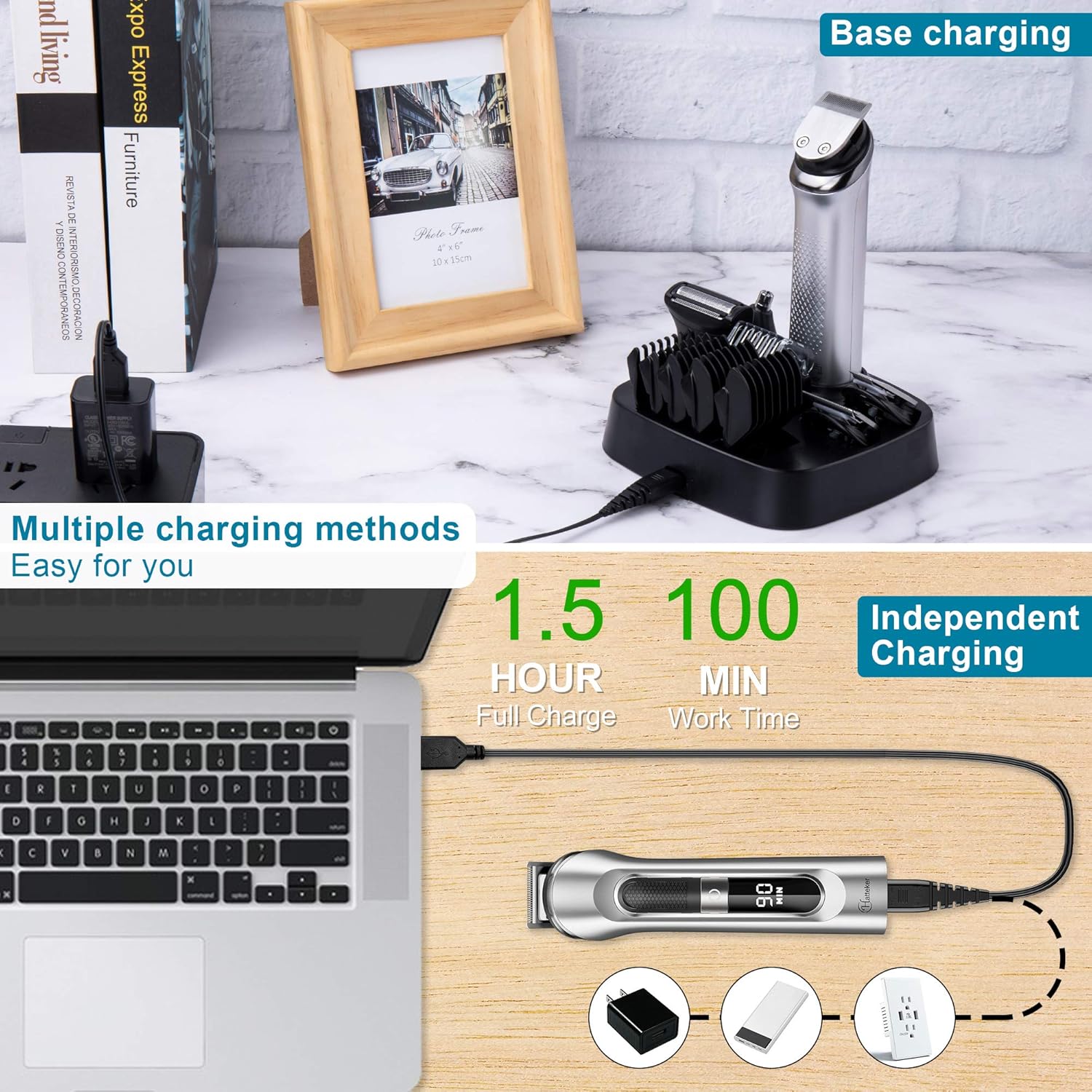 【2 oplaadmethoden en USB-oplaadbaar】Deze machine kan worden opgeladen via de basis of afzonderlijk. Ingebouwde oplaadbare batterij levert tot 100 minuten looptijd per lading door slechts ongeveer 1,5 uur opladen. Hoge prestaties kunnen overal worden bereikt. Het is klein en draagbaar.