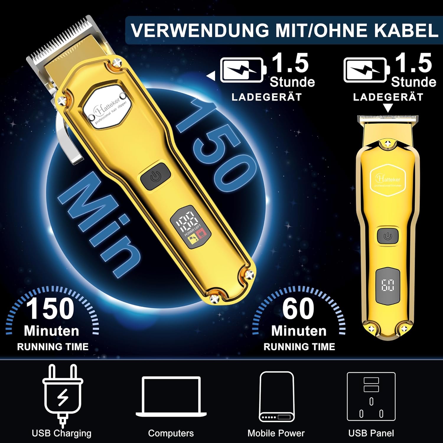 Hatteker Professionele tondeuse Mannen baard- en haartondeuse Tondeuse met schaar Snoerloze set Verwijderbaar T-mes Waterdichte tondeuse voor lang haar (goud)