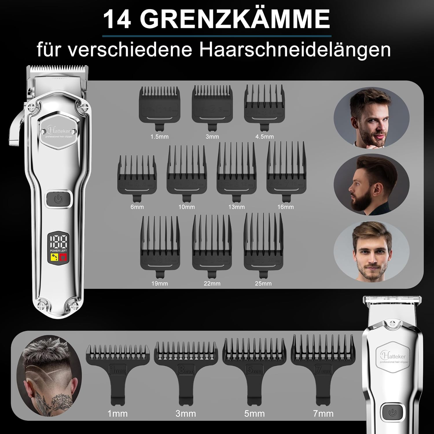 Hatteker Professionele tondeuse Mannen baard- en haartondeuse Tondeuse met schaar Snoerloze set Verwijderbaar T-mes Waterdichte tondeuse voor lang haar (zilver)