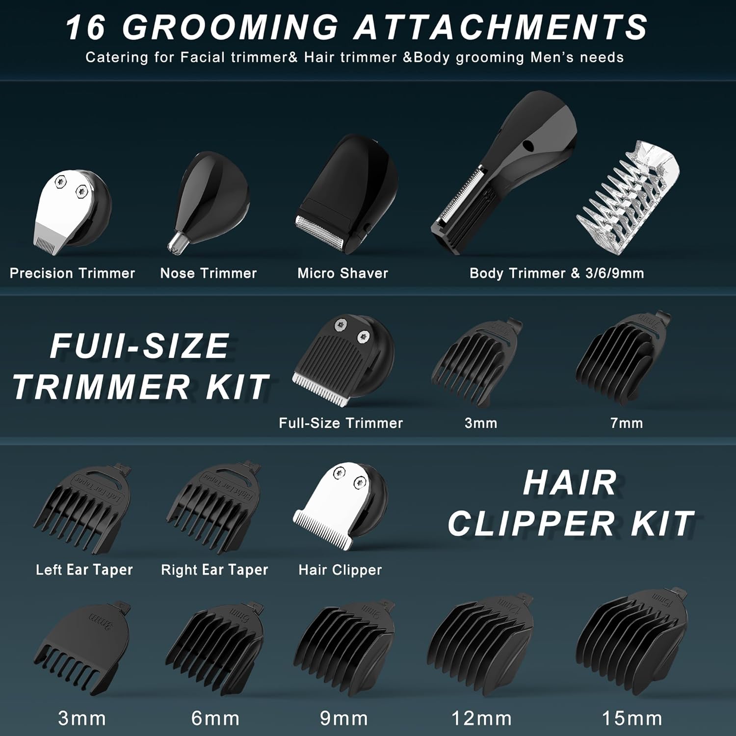 【21-in-1 multifunctionele verzorgingsset】: bevat een reeks accessoires voor lichaamsverzorging, kapsel, baardgrootte, scheren van lichaamshaar en precisieafwerking. Met verschillende lengtegeleidingskammen (3 mm/6 mm/9 mm/12 mm/15 mm voor de T-bladkop; 3 mm/7 mm voor de trimmerkop in volledige grootte; links/rechts verloop voor de oren) zorgt het voor een zachte en nauwkeurige snijervaring van top tot teen.
