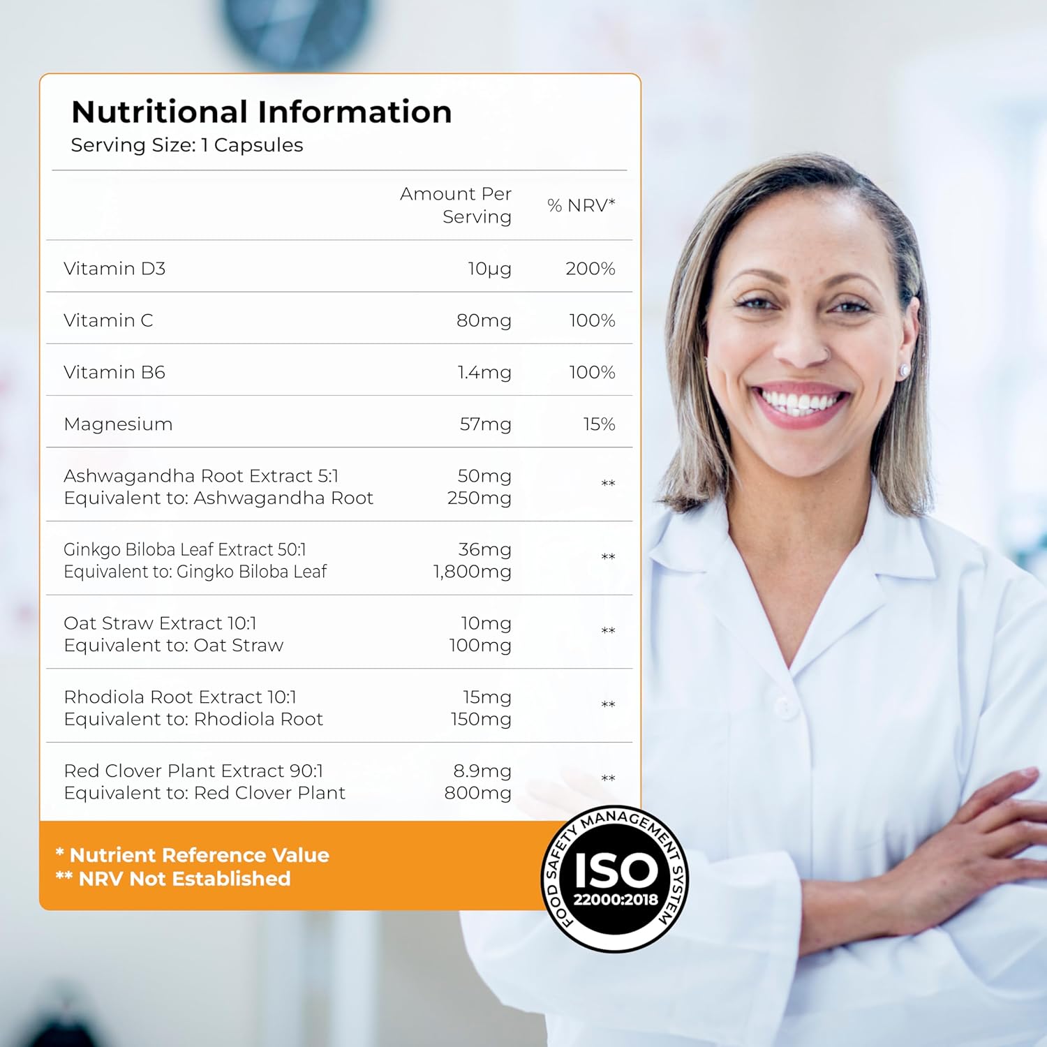 BEVAT EEN ZORGVULDIG GEFORMULEERDE mix van voedingsstoffen voor dagelijkse ondersteuning: VITAMINEN B6, C en D. MINERAAL Magnesium. BOTANICALS Rode Klaver, Ashwagandha, Ginkgo Biloba, Haverstro en Rhodiola-wortel