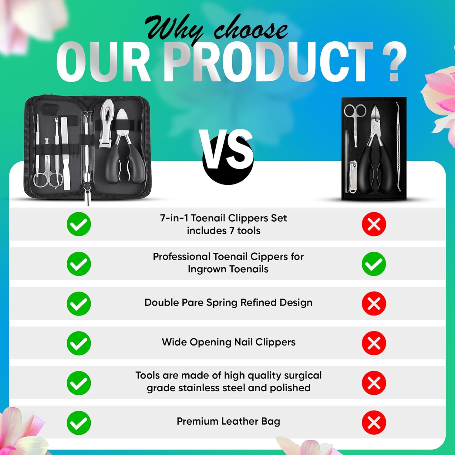 Wat is inbegrepen? : 7-in-1 teennagelknipper set bevat 7 gereedschappen, 1 x brede kaak nagelknipper, 1 × podoloog teennagel tondeuse, 1 × ingegroeide teennagel vijl, 1 × nagelriem duwer, 1 × teennagel lifter, 1 × nagelvijl, 1 × neustondeuse, 1 × lederen tas. Met onze set kun je overal genieten van een professionele look.