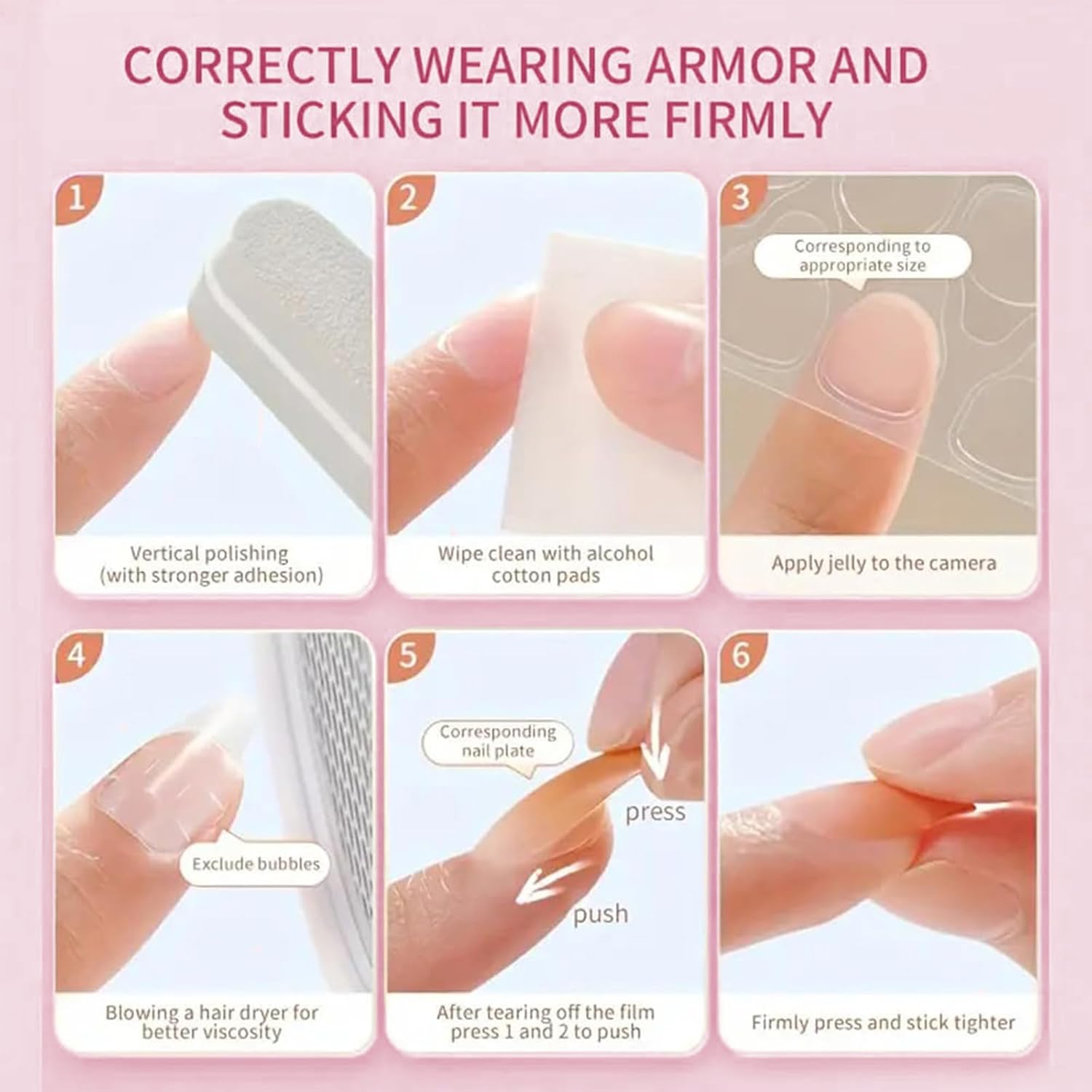 Step-by-step nail application guide showing four numbered stages of applying pink-toned artificial nails, with demonstration on actual nails.Step-by-step nail application guide showing four numbered stages of applying pink-toned artificial nails, with demonstration on actual nails.
