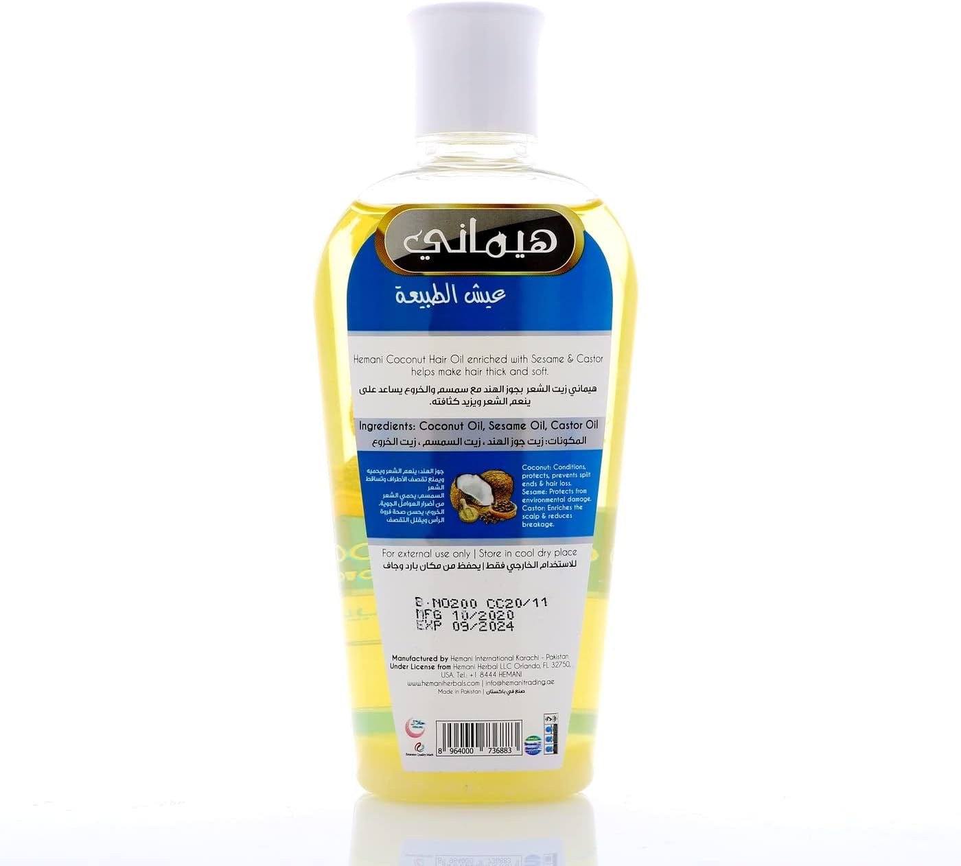 Hemani kokosolie is een mengsel van kokos-, castor- en sesamolie. Deze ingrediënten maken het haar dik en zacht.