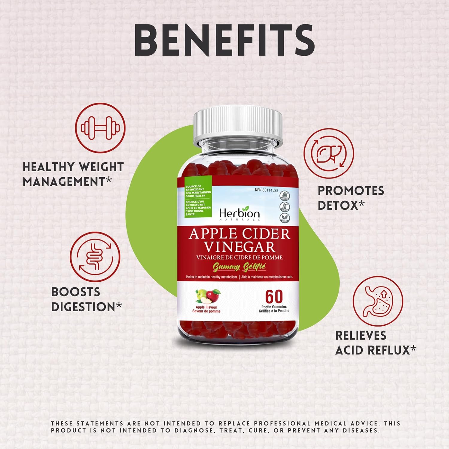 This is my third order of Herbion Naturals Apple Cider Vinegar gummies. I bought them the first time mainly because I was having horrible bloating issues and nothing I tried was helping. I have a hard time taking capsules and when I saw that these were in gummy form, I decided to do some research before ordering.One thing that I especially liked is that the company only makes herbal and natural supplements. I felt safe ordering from them. I have never used a gummy supplement before (felt they were for kids only!). I love the flavour of these. They are extremely strong smelling, but very good tasting, and do not leave a sickly sweet taste in your mouth.There are 60 gummies, and you only take one a day, so enough for two months. I think the price is excellent. Many supplements you need to take three or more a day so I was really pleased that one a day was enough. Within the first six weeks, I started to notice that my bloating was not as bad. I had been living with it for several years and it bothered me so much that I couldn’t eat. I am now on my third order of these and while I haven’t weighed myself, my bloat is gone. I can fit into pants that I couldn’t fit into before so I know these are working. While I didn’t think I had any digestive issues before, I was having occasional reflux and that has totally disappeared as well. I am extremely happy with this product and am looking at trying some of the other supplements that they offer.