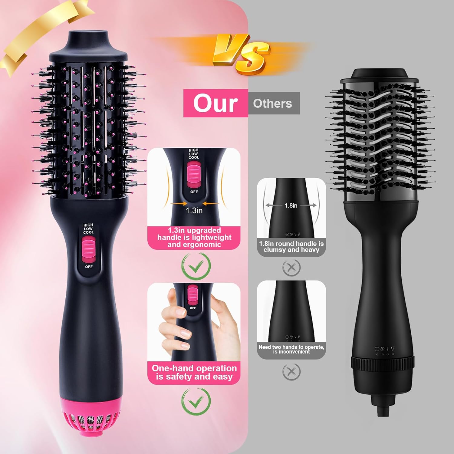 ▸ Ergonomisch OntwerpHet ontwerp van de haardrogerborstel is ovaal van vorm. Het verbeterde handvat is dunner en beter afgestemd op de grootte van de handpalm van een vrouw, wat het comfortabeler maakt om vast te houden.