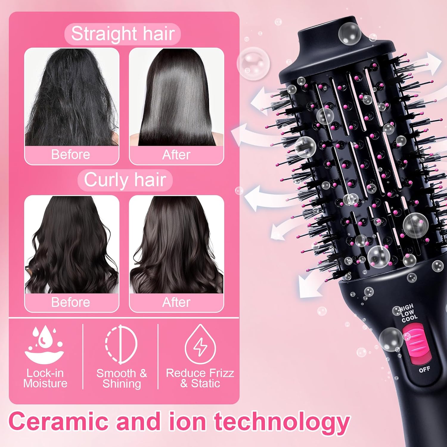 Meer verzorging voor je haar: Ontworpen met nylon pinnen en geborstelde borstelharen om klitten te voorkomen en volume en glans te geven. Uniek ovaal ontwerp, speciaal om het haar te gladstrijken, terwijl de ronde randen volume creëren. De ingebouwde ionengenerator kan negatieve ionen afgeven om de haartoestand te verbeteren, terwijl het kroezen en statische elektriciteit vermindert, waardoor je haar glatter en glanzender wordt.