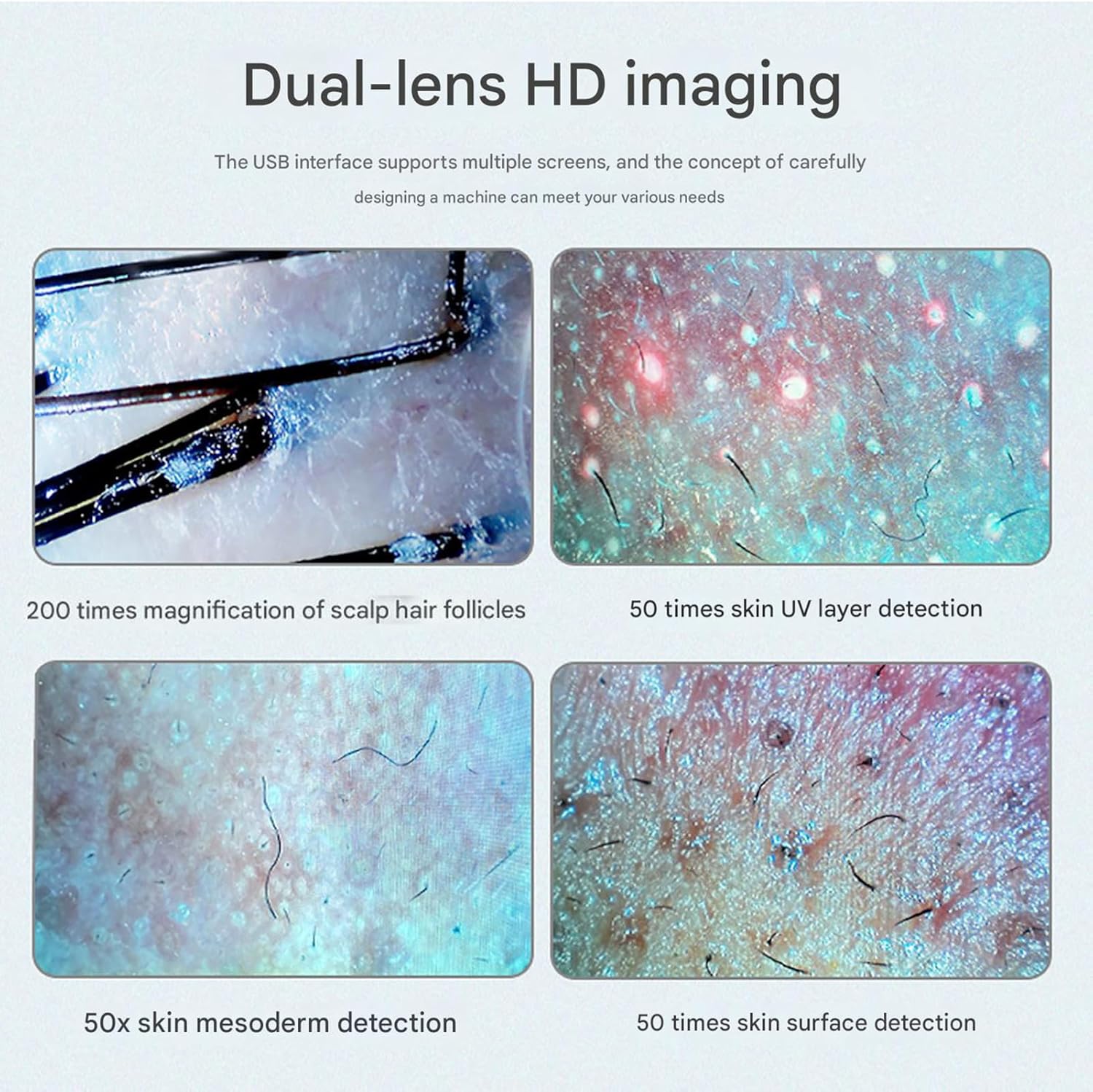 50X EN 200X LENZEN: Met een keuze uit 50x en 200x lenzen kan onze haar- en huidanalyser gemakkelijk in- en uitzoomen, voor veelzijdigheid en precisie