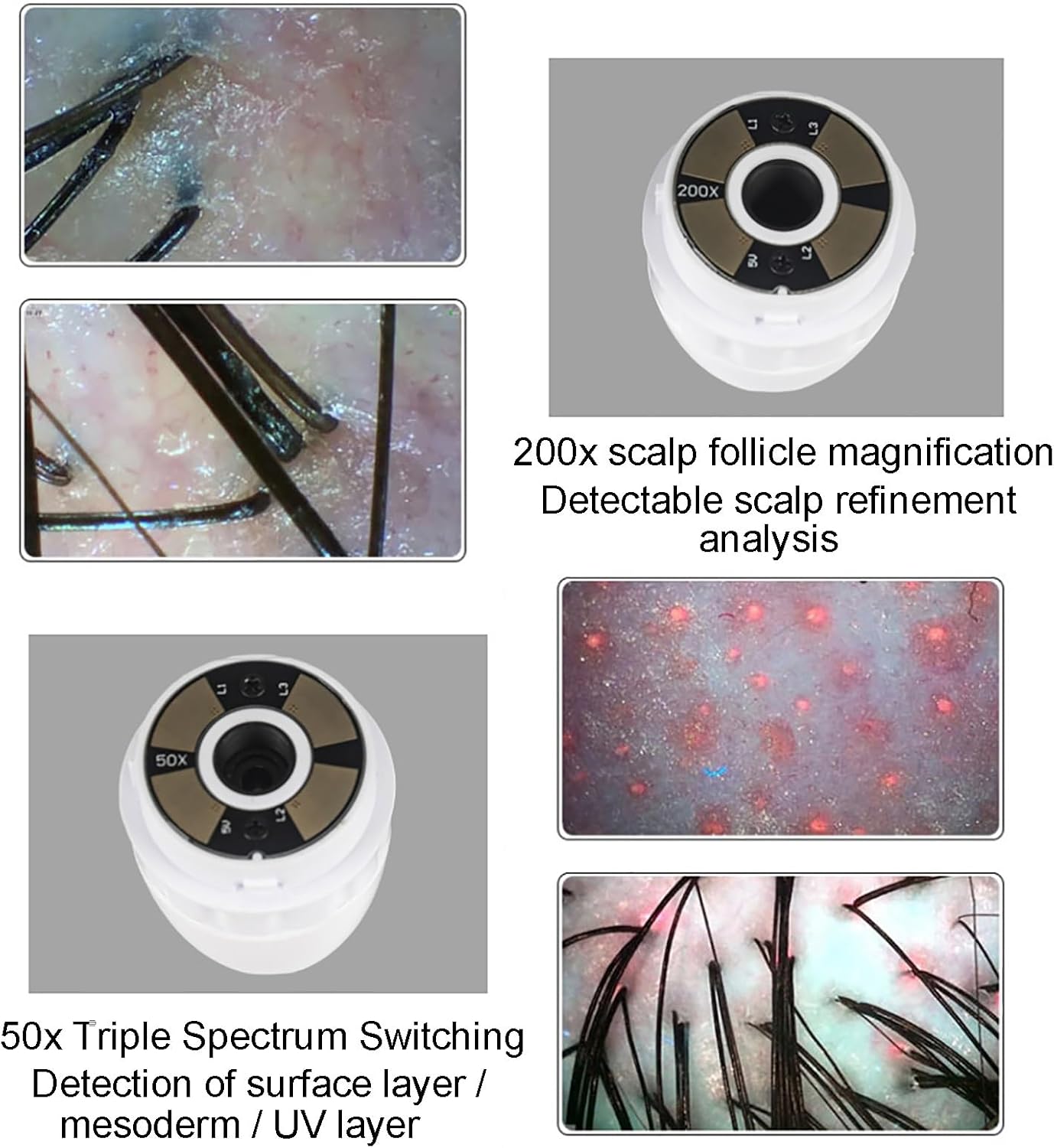 Dubbele lenzen: 50x en 200x lenzen zijn standaard for huiddiagnose, 50x for huiddetectie en 200x for haardetectie, en ondersteunen diverse lenzen. De high-definition camera biedt een duidelijkere detectie, zodat u direct en duidelijk de conditie van uw huid en hoofdhuid kunt zien.