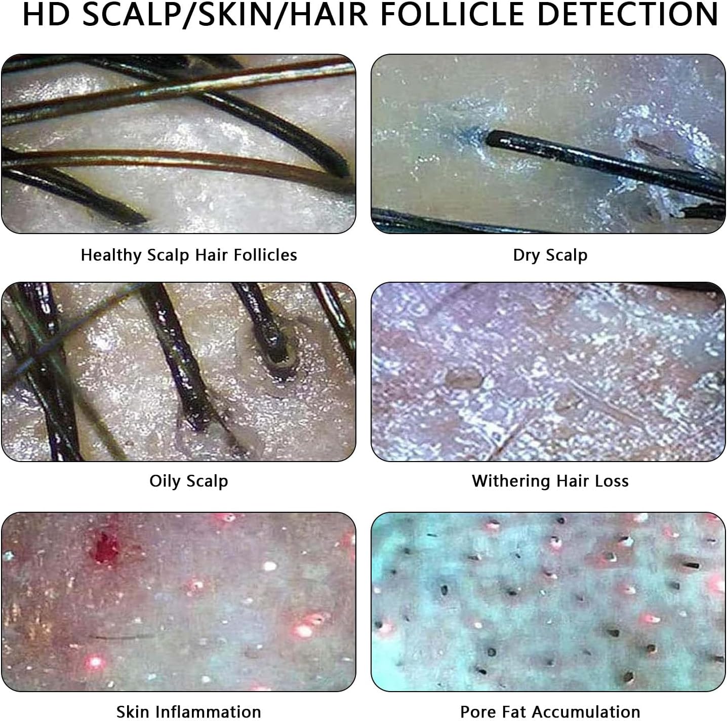 【MULTIFUNCTIONELE HOOFDHUID TESTER】Kan worden gebruikt om de mate van haarverlies te identificeren; test haarvocht; test het oliegehalte van de hoofdhuid; haarzakjesproblemen opsporen; hoofdhuidgevoeligheid testen. Geschikt voor kapperszaken, schoonheidssalons, massagesalons, enz.