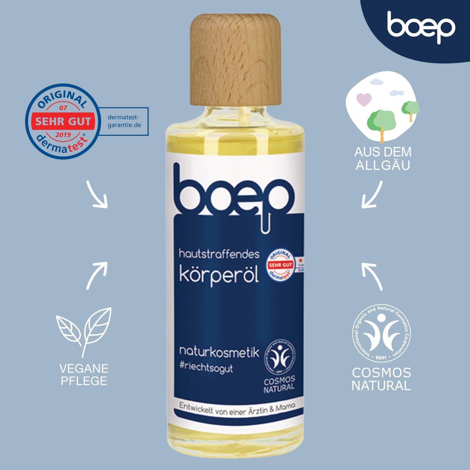 De verstevigende lichaamsolie van das boep is speciaal ontwikkeld voor de gestreste huid tijdens en na de zwangerschap. Zorgvuldig geselecteerde, natuurlijke oliën en algenextracten hydrateren en hebben bewezen de elasticiteit en veerkracht van de huid te verhogen bij regelmatig gebruik. De zwangerschapsolie tegen striae ondersteunt de huid bij het optimaal voorkomen en verminderen van striae en groeistrepen. De verstevigende olie is natuurlijk niet alleen geschikt voor moeders en zwangere vrouwen – maar voor iedereen die een intensief gevoede, stevigere huid wil!