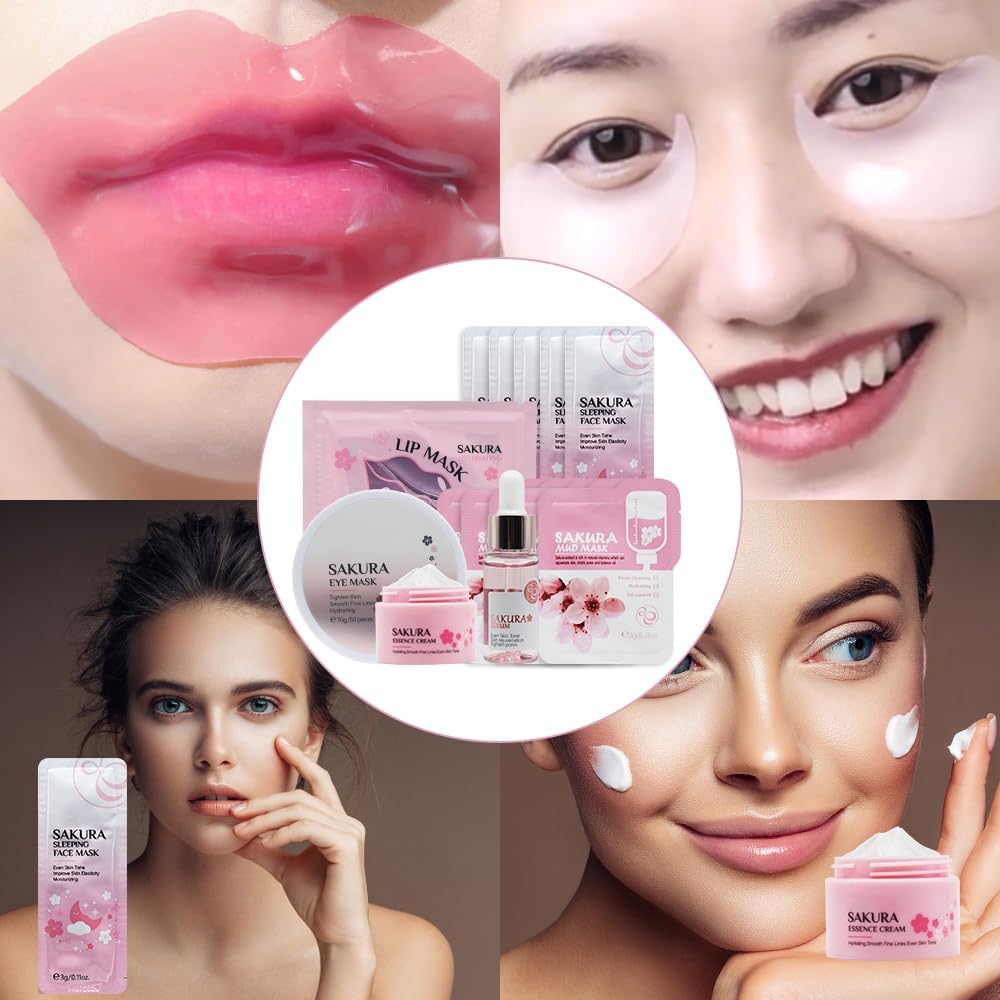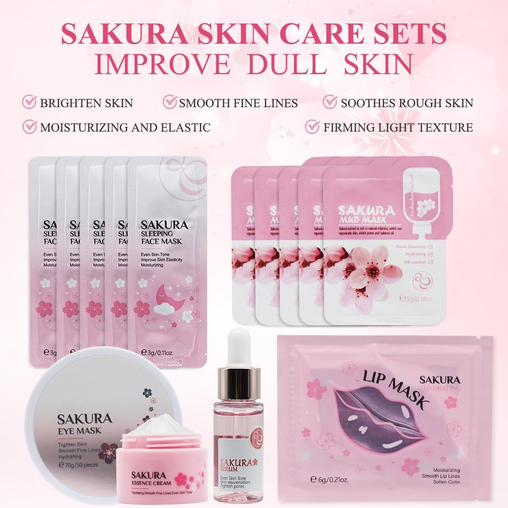Sakura huidverzorgingsset: de Sakura huidverzorgingsset bestaat uit 14 delen, waaronder crème, serum, oogmasker, 1 lippenmasker, 5 slaapmaskers en 5 reinigingsmaskers van klei. Biedt een optimale reiniging en vochtverzorging voor je huid en maakt deze gehydrateerd en soepel.
