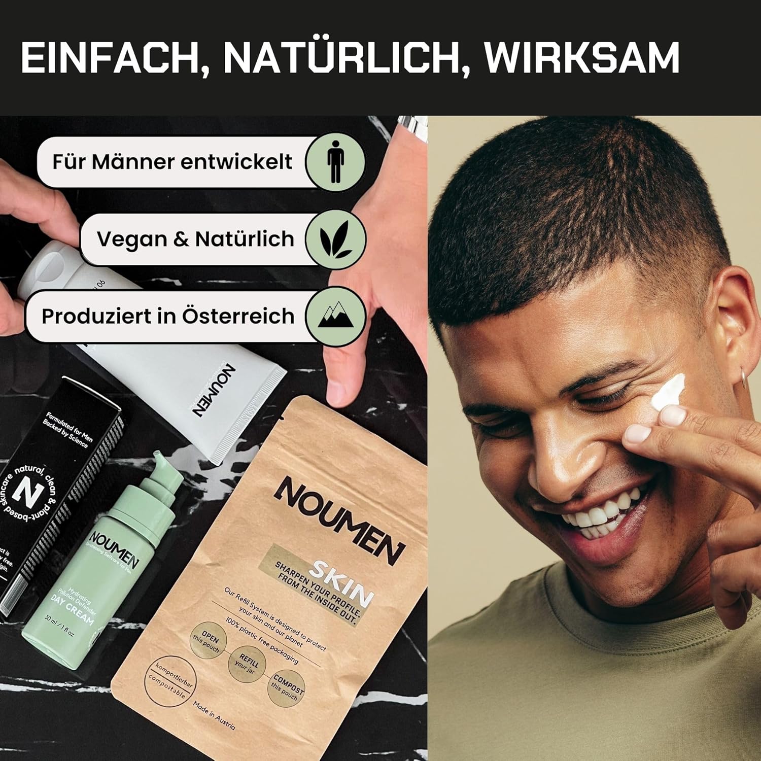 Huidverzorgingsset voor mannen: wasgel, vochtinbrengende crème en huidsupplement voor een gezonde huid – veganistisch & natuurlijk, 60 dagen voorraad, Made in Oostenrijk