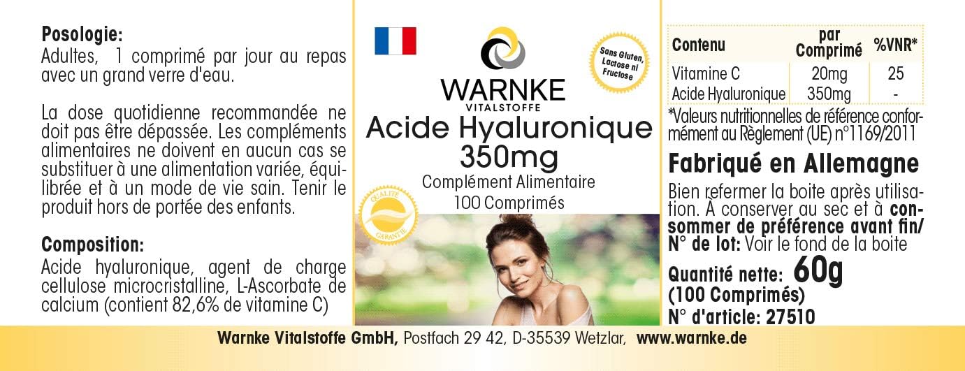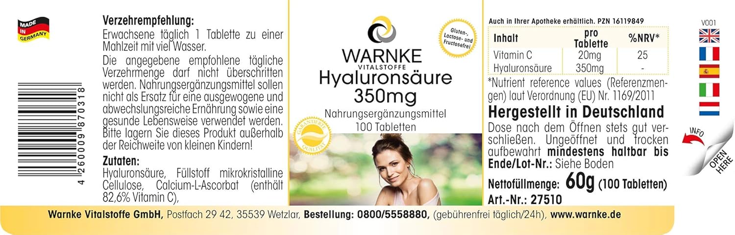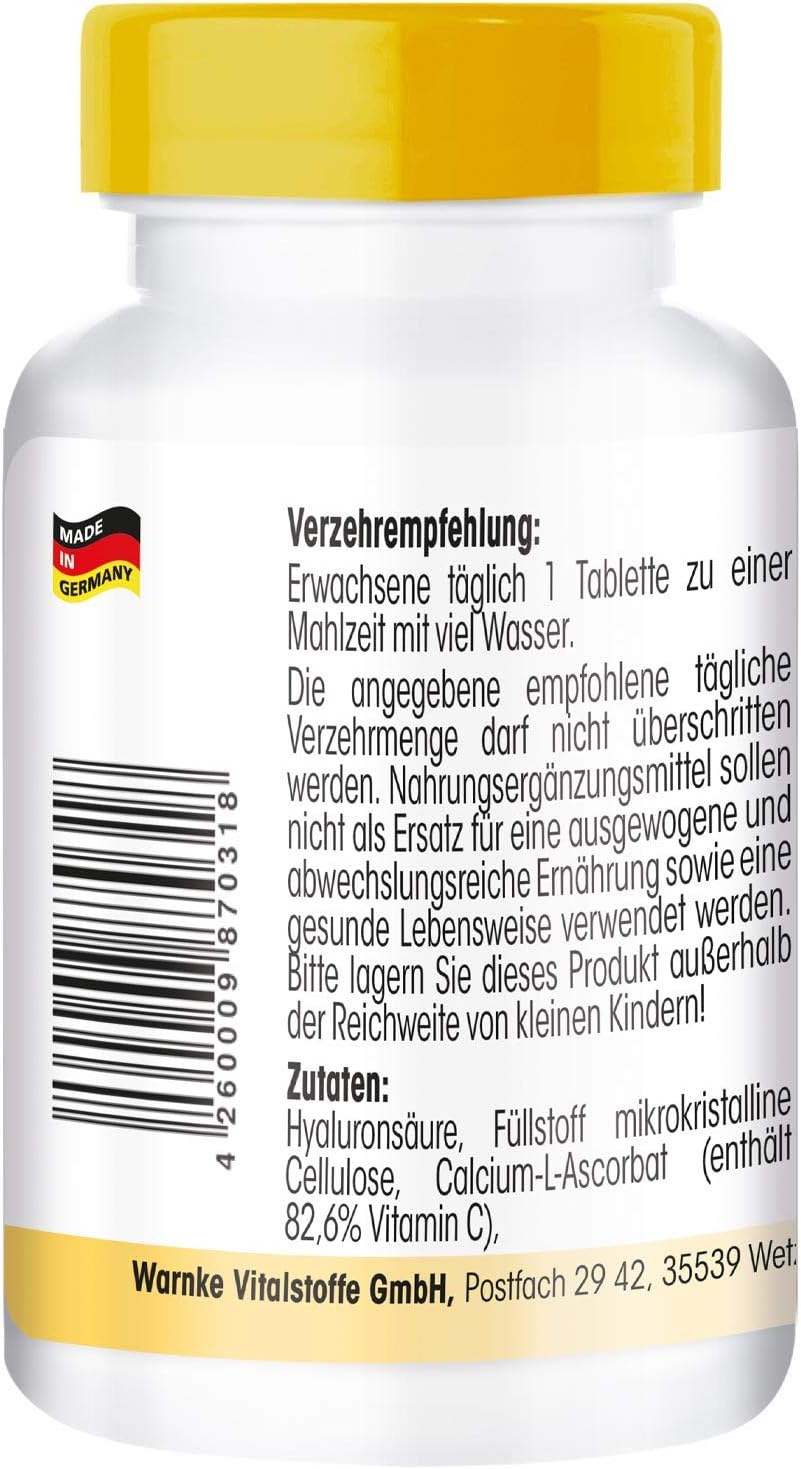 Uitstekende prijs-kwaliteitverhouding voor Duitse kwaliteit – Warnke Vitalstoffe – hyaluronzuur tabletten – met vitamine C – 100 veganistische tabletten