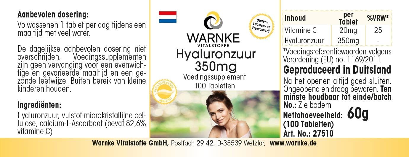 Hyaluronzuur tabletten – 350mg – veganistisch – met vitamine C – 100 tabletten | Warnke Vitalstoffe – Duitse apothekerskwalitei