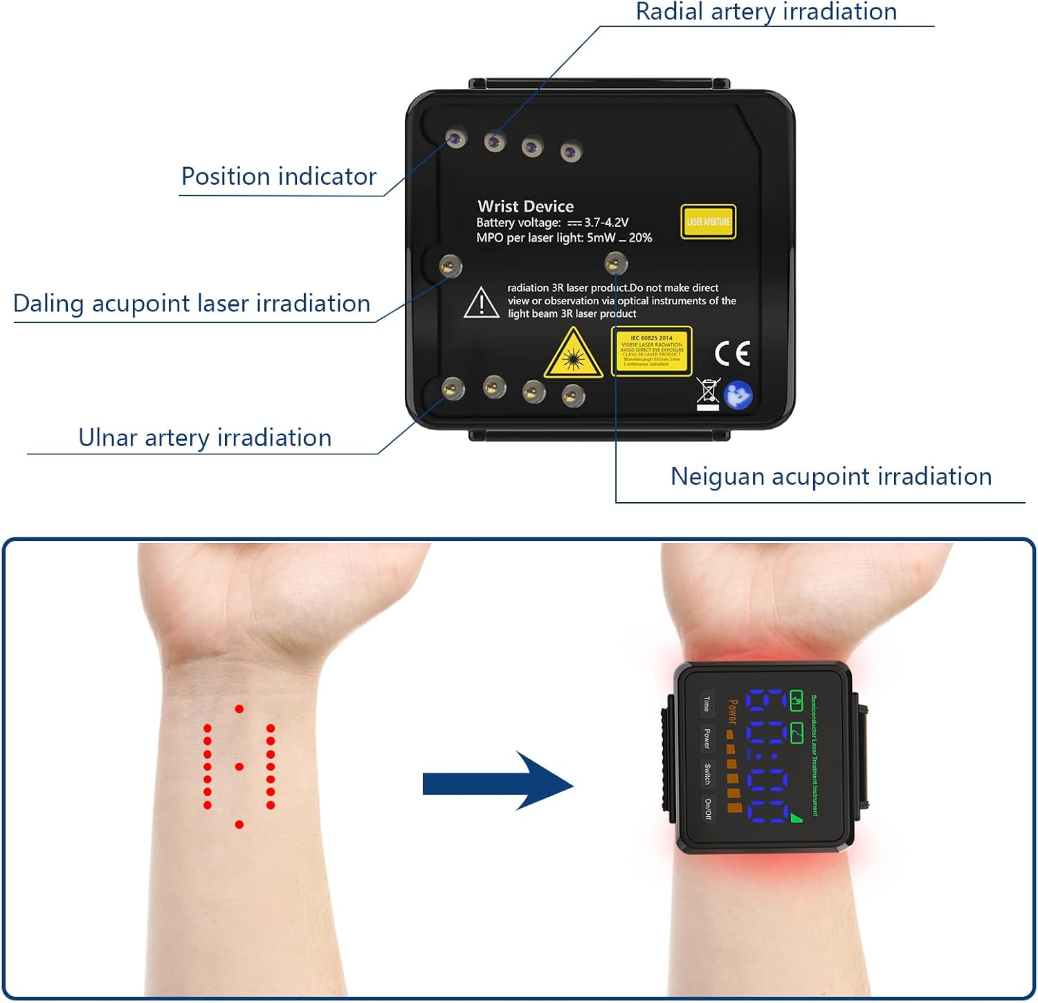 Voorzorgsmaatregelen: het wordt aanbevolen om onze rode lichtbehandelingsuitrusting eenmaal per dag te gebruiken, ‘s ochtends en ‘s avonds te gebruiken, 30-60 minuten elke keer (stel de tijd in volgens je persoonlijke behoeften), draag dit product om de linkerpols als je het gebruikt om ervoor te zorgen dat de energie van de koude laser precies kan passeren. De bijbehorende acupunctuurpunten en slagaders geven je rust en effectieve behandeling.