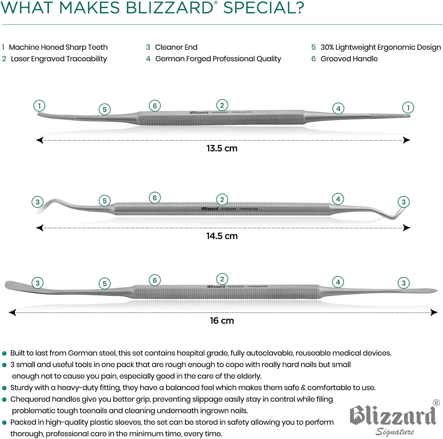 Ingegroeide Teennagel Behandelen Set Vijlen van Blizzard – 3 Delige Set Dubbel-Uiteinde Pedicure Gereedschap met Black´s Vijl, Nagelreiniger en Nagellifter – Eersteklas Roestvast Staal