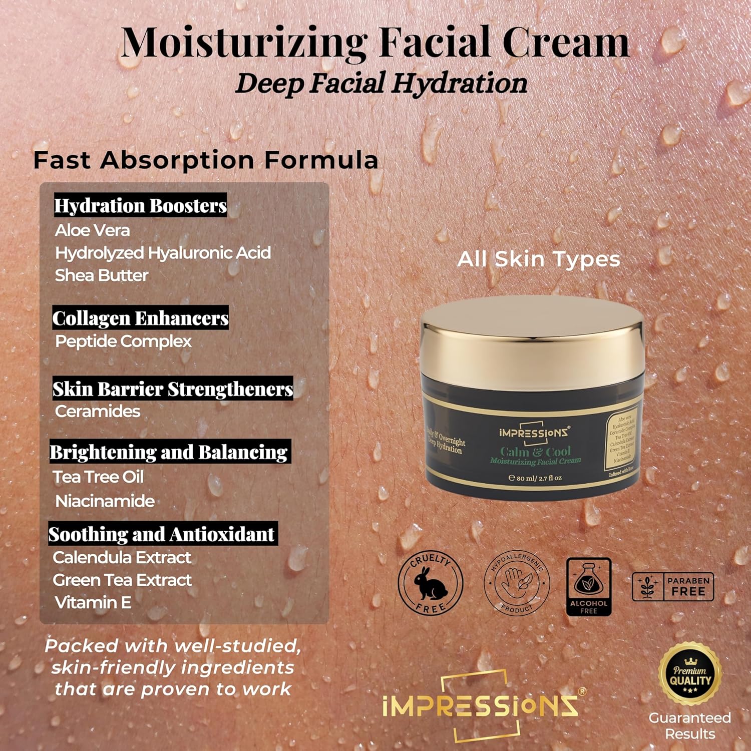 The ImpressionZ Instant Visible Results Hydrating Moisturizer is a collagen-boosting face cream designed to hydrate, lift, and firm your skin for a radiant, youthful glow. Infused with aloe vera, this moisturizer provides long-lasting hydration, nourishing and plumping your skin while combating dryness and dullness. The rapid absorption formula penetrates deeply into your skin, replenishing lost moisture without leaving a greasy or sticky residue. Suitable for all skin types, it is gentle enough for sensitive skin, making it an excellent choice for both your face and body. Free from harsh ingredients like dyes and alcohol, this cruelty-free moisturizer is a safe and effective solution for anyone looking to achieve soft, luminous, and firm skin. Whether used as a day cream, night cream, or under-eye moisturizer, this versatile product seamlessly integrates into any skincare routine. Perfect for daily use, it leaves your skin feeling refreshed, hydrated, and visibly lifted, helping you achieve a smooth, youthful complexion every day.