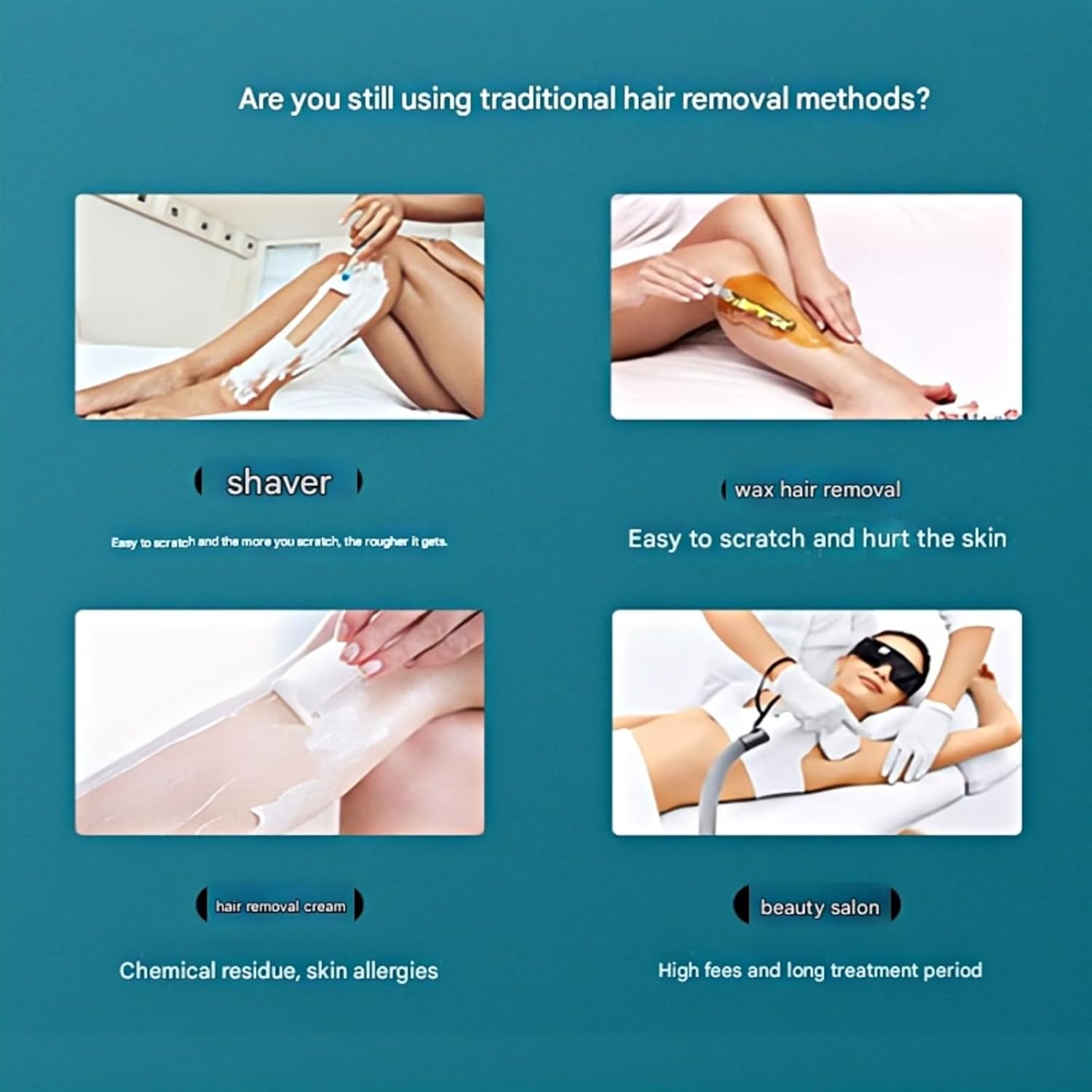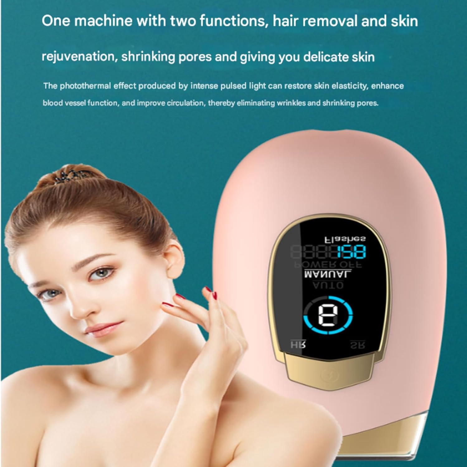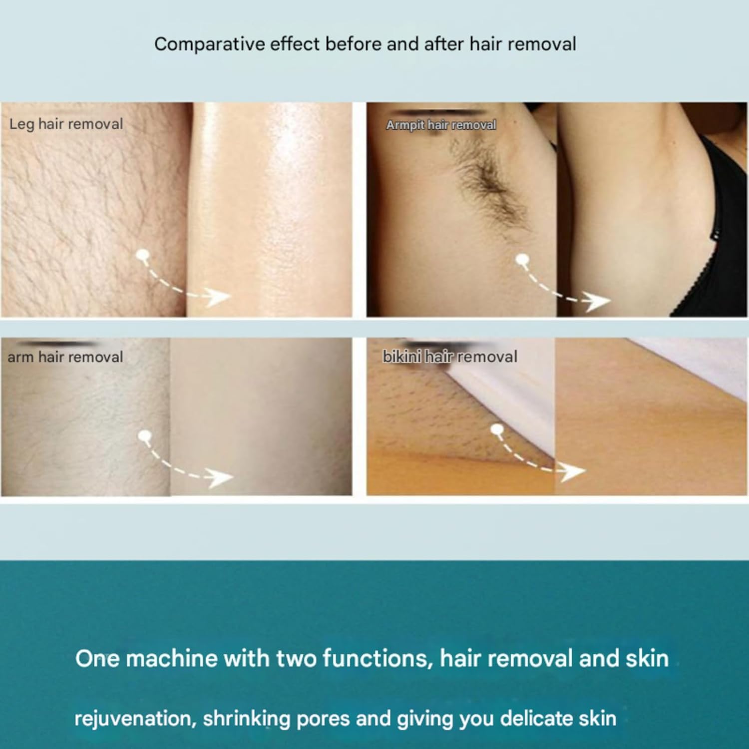Eén machine voor twee doeleinden, ontharing en huidverjonging! Ontharing + huidverjonging dubbele modus, sterk gepulseerd licht krimpt poriën en herstelt de elasticiteit van de huid. Ruwe huid na ontharing? Dit ontharingsapparaat kan niet alleen haar verwijderen, maar ook de collageenproductie stimuleren en fijne lijntjes vervagen. Besteed 5 minuten verzorging na het baden, en je huid zal zo delicaat zijn als een baby, en je hoeft je geen zorgen meer te maken over “zwarte vlekken” en kippenhuid!