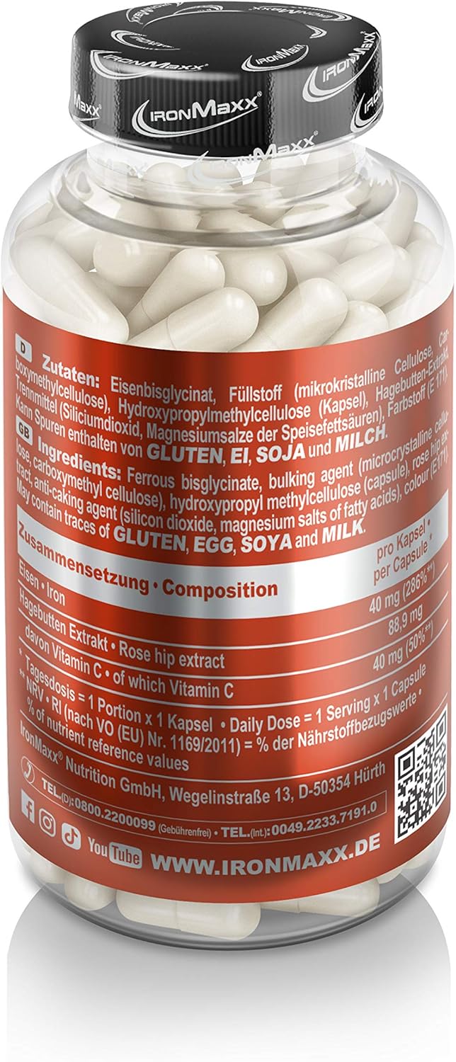 Daarnaast bevindt zich in de Iron + Vitamine C-capsules van IronMaxx rozenbottelextract, dat natuurlijke vitamine C levert. Vitamine C verhoogt de ijzeropname. Daarom is een extreem belangrijke toevoeging in het product en onmisbaar. Bovendien is het product 100% veganistisch. De gebruikte capsulehoes is gemaakt van HPMC, dus van cellulose.
