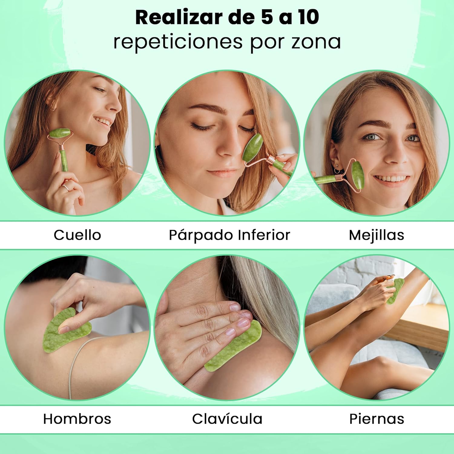 Het moet met een schone huid en een geschatte tijd van ca. 5 minuten worden gebruikt, de rol wordt gebruikt voor gezicht en hals en de Gua-Sha-steen voor gebruik in de kaak.