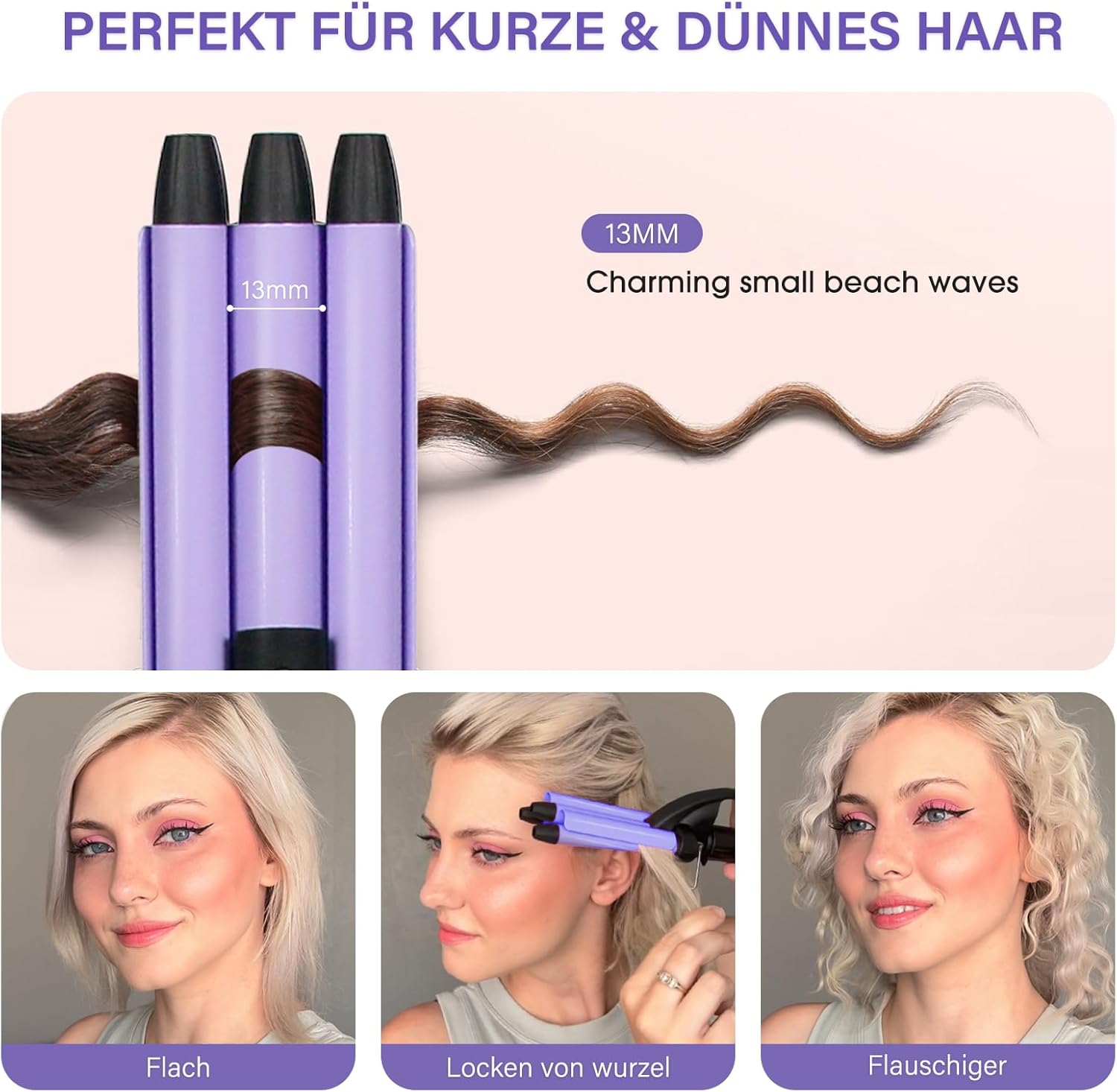 janelove Mini-krultang, 13 mm, met 3 stangen, voor kort haar, 200 °C, keramiek, strandgolven, perfect voor op reis, paars