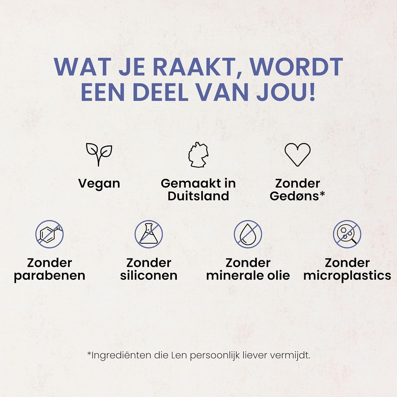 - Zonder ingrediënten van dierlijke oorsprong, parabenen, siliconen, microplastics & minerale oliën