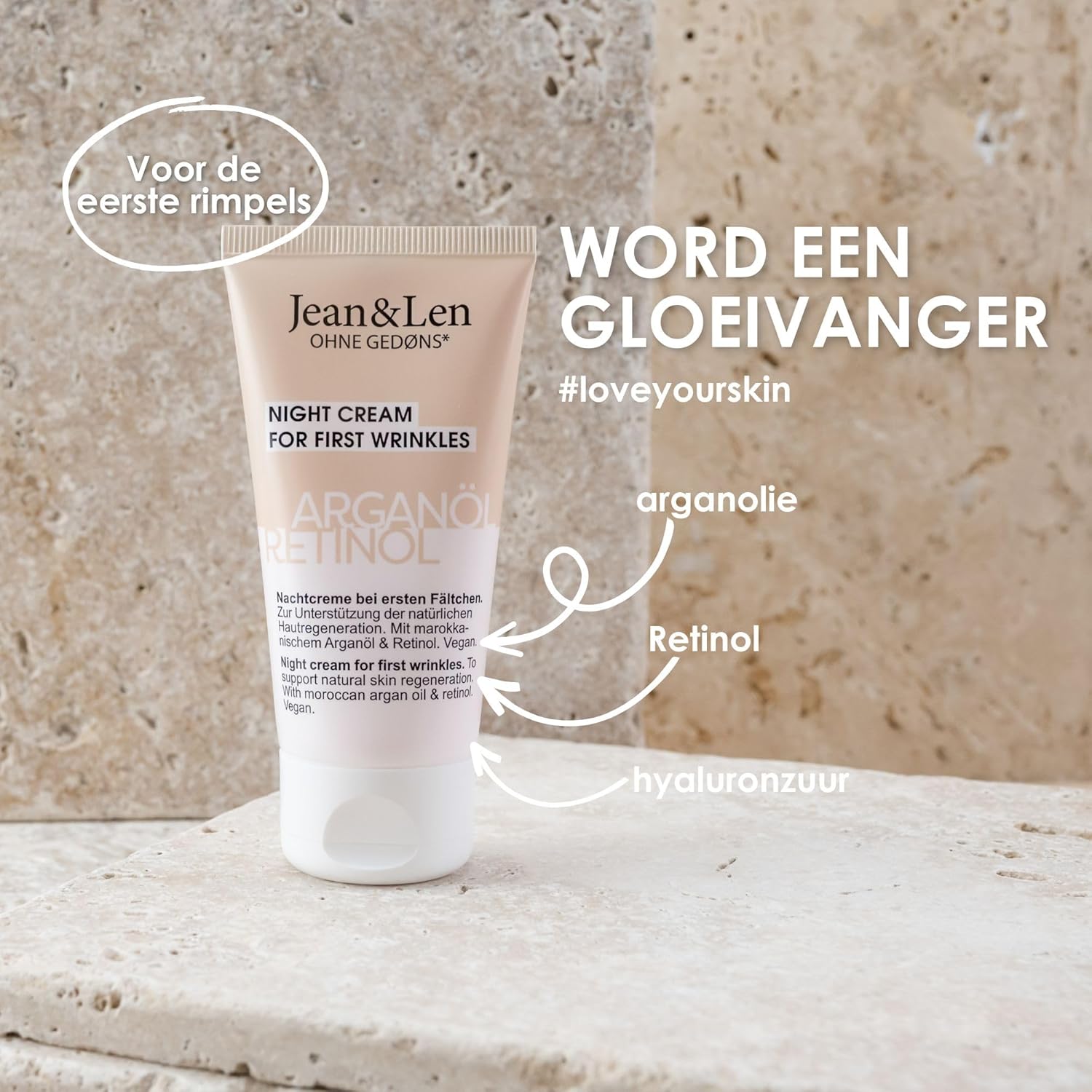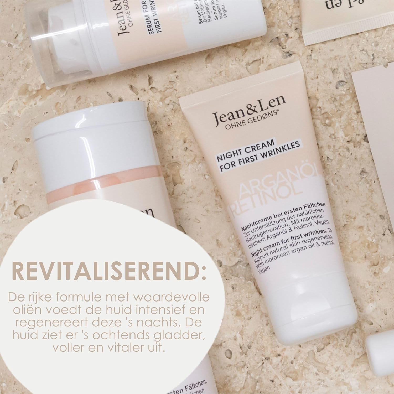 Jean & Len Nachtcrème, arganolie & retinol, voor eerste rimpels, ondersteunt huidregeneratie, vermindert spanning, zonder parabenen & siliconen, vegan, 50 ml.