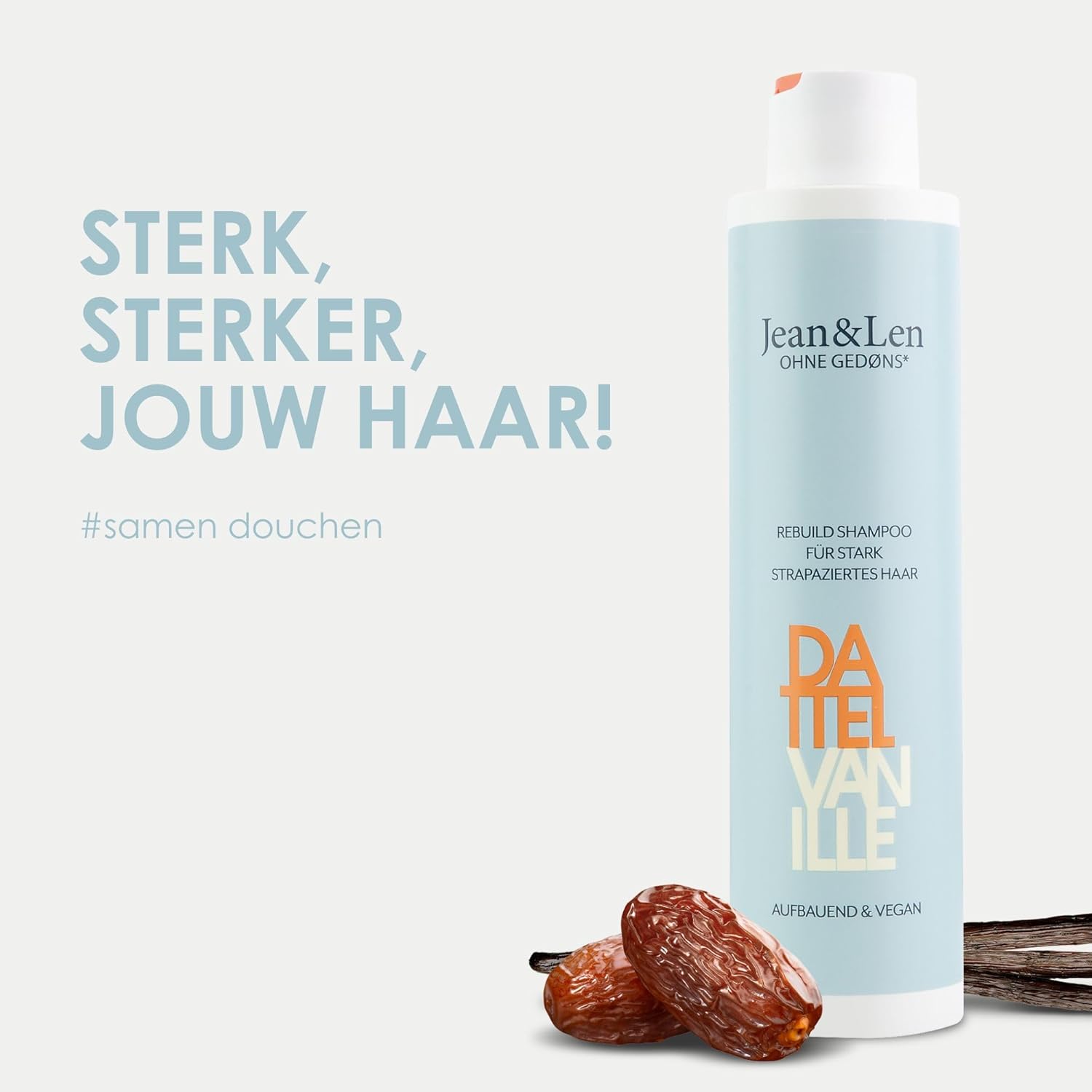 Jean & Len Rebuild Shampoo Date & Vanilla, voor zwaar beschadigd haar, maakt het haar sterker en glanzender, met vanillegeur, shampoo zonder siliconen & parabenen, veganistisch, 300 ml