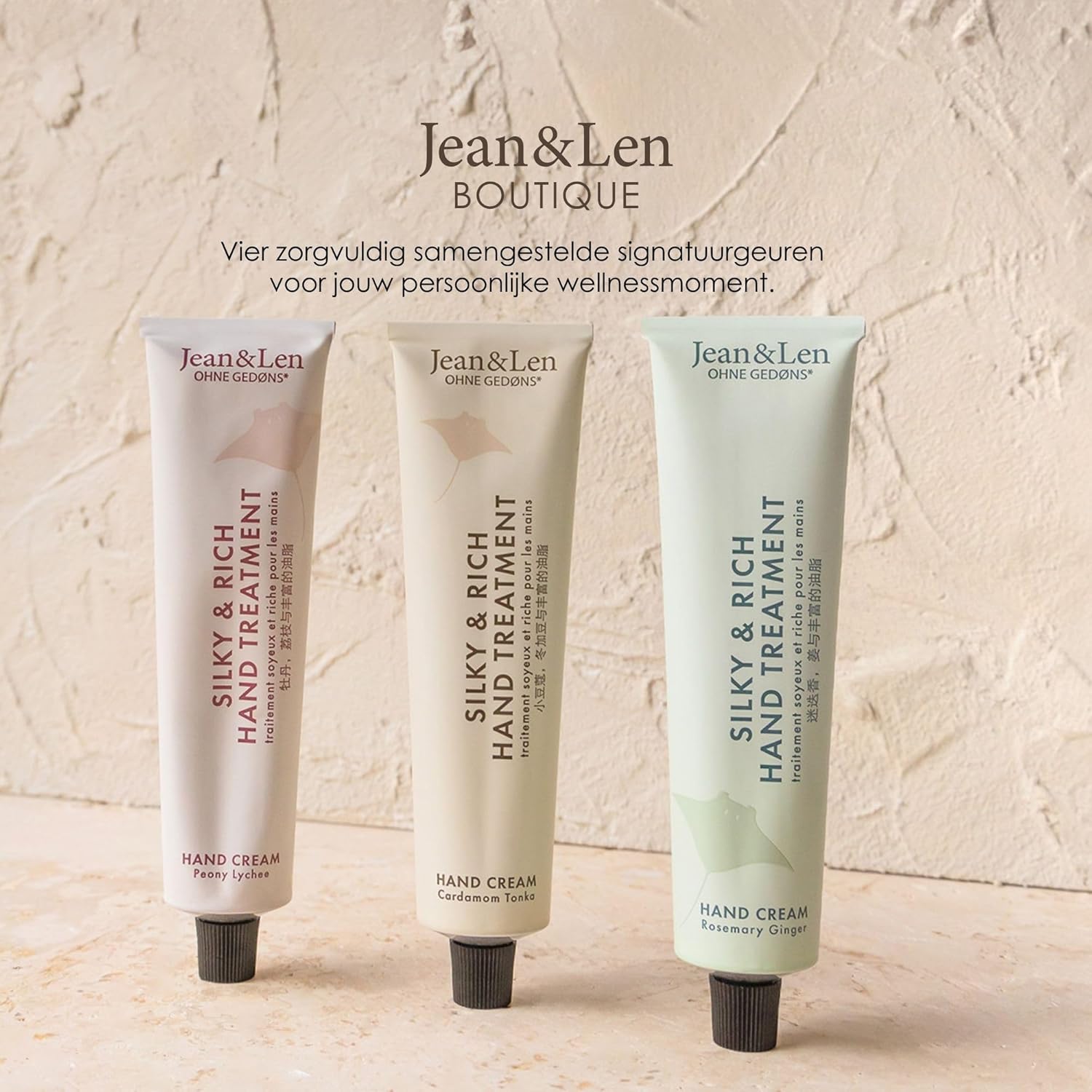 Jean & Len Silky en Rich Treatment Cardamom en Tonka, 100 procent recyclebare aluminium tube (zonder deksel), rijke handcrème, voor zachte handen, zonder parabenen en siliconen, vegan, 75 ml