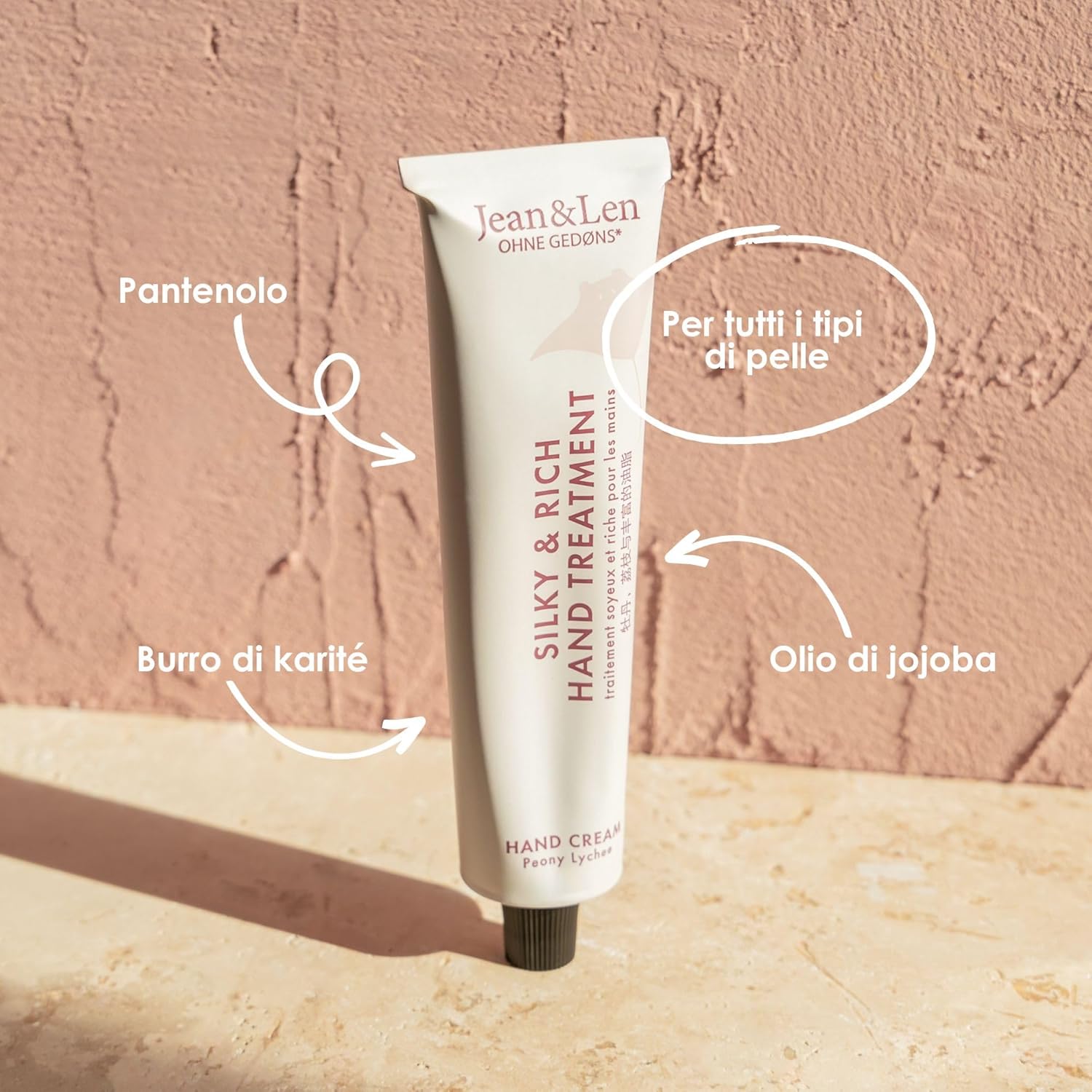 Jean & Len Silky en Rich Treatment Peony en Lychee, 100 procent recyclebare aluminium tube (zonder deksel), rijke handcrème, voor zachte handen, zonder parabenen en siliconen, vegan, 75 ml