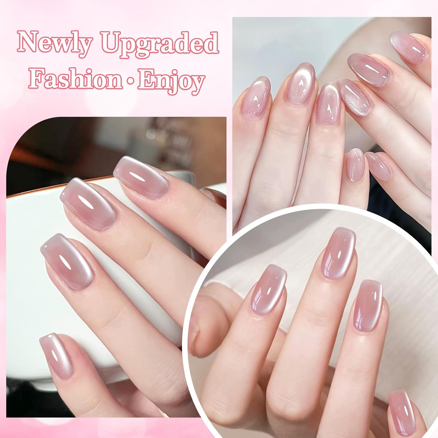 Roze jelly cat’s eye nagellak: de kristalheldere textuur is perfect geïntegreerd met het glanzende cat’s eye effect De roze kleur is net als de kersenbloesem in de vroege lente, waardoor een zoete en charmante natuurlijke nude nagellak ontstaat