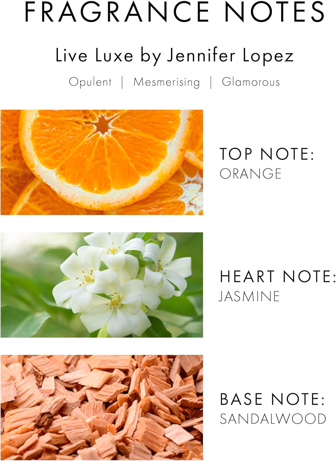 Live Luxe is een fruitige bloemengeur geïnspireerd op Jennifers passie voor dansen en alles wat met luxe te maken heeft. Hij opent met sappige mandarijn, appel en citroen. Het hart is een sprankelend boeket van roos, jasmijn, lelietjes-van-dalen en ylang-ylang. De geur wordt gecompleteerd door amber, bessen, sandelhout en muskus in de basis. Live is opulent, betoverend en in alles onze pracht!